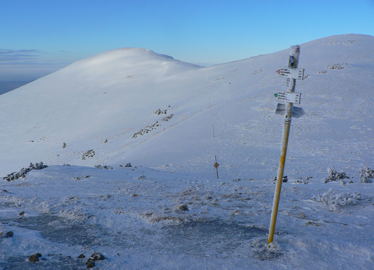 Nad 1000m to bol iný svet, na hrboľatom betóne vrstvička sypkého čerstvého snehu, len sedlá viac vyfúkané. Najhoršie bol na tom Priehyb - až do trávy. Okolie chaty pod Chlebom (Révajka, Hromové a tak...) boli poriadne počmárané. Na hrebeni samozrejme viac pešiakov, väčšina z nich na mačkách. Vyskytli sa aj nejakí ľudia na pásoch, ale nezdalo sa, že by si to príliš užívali.