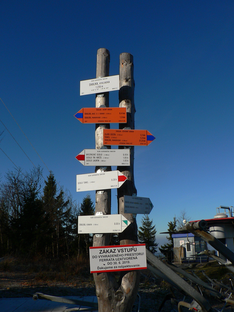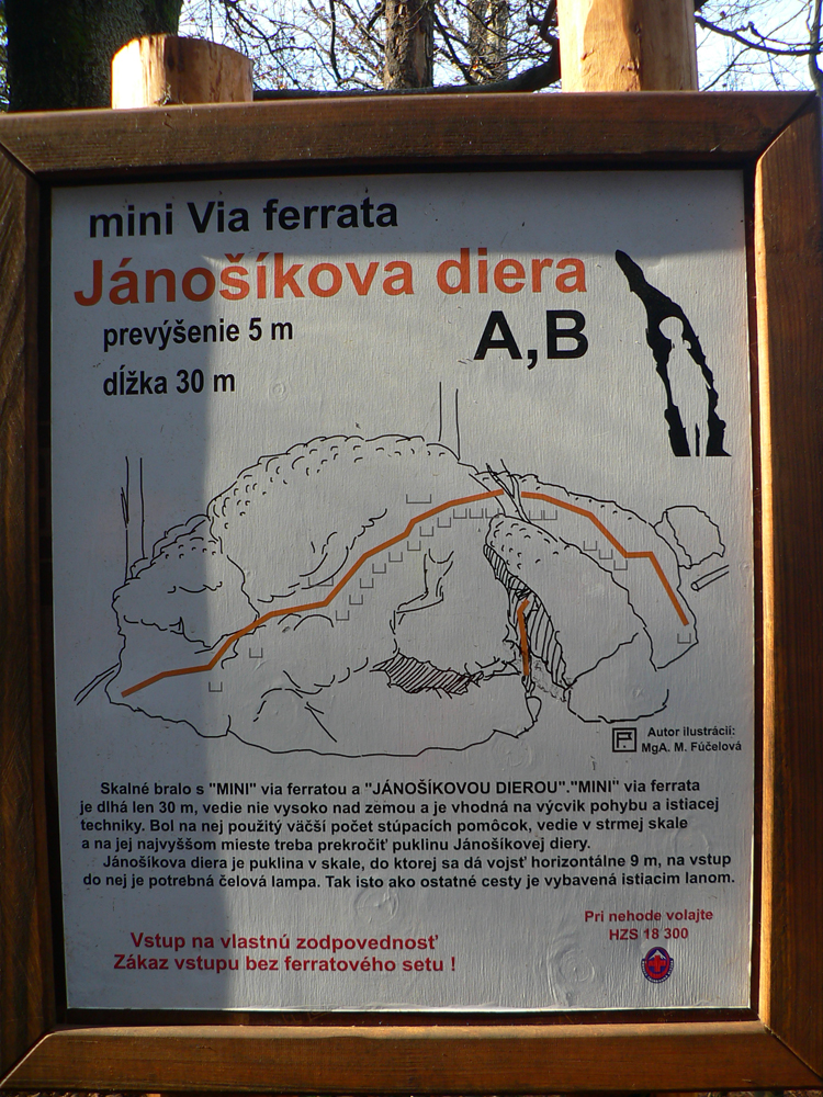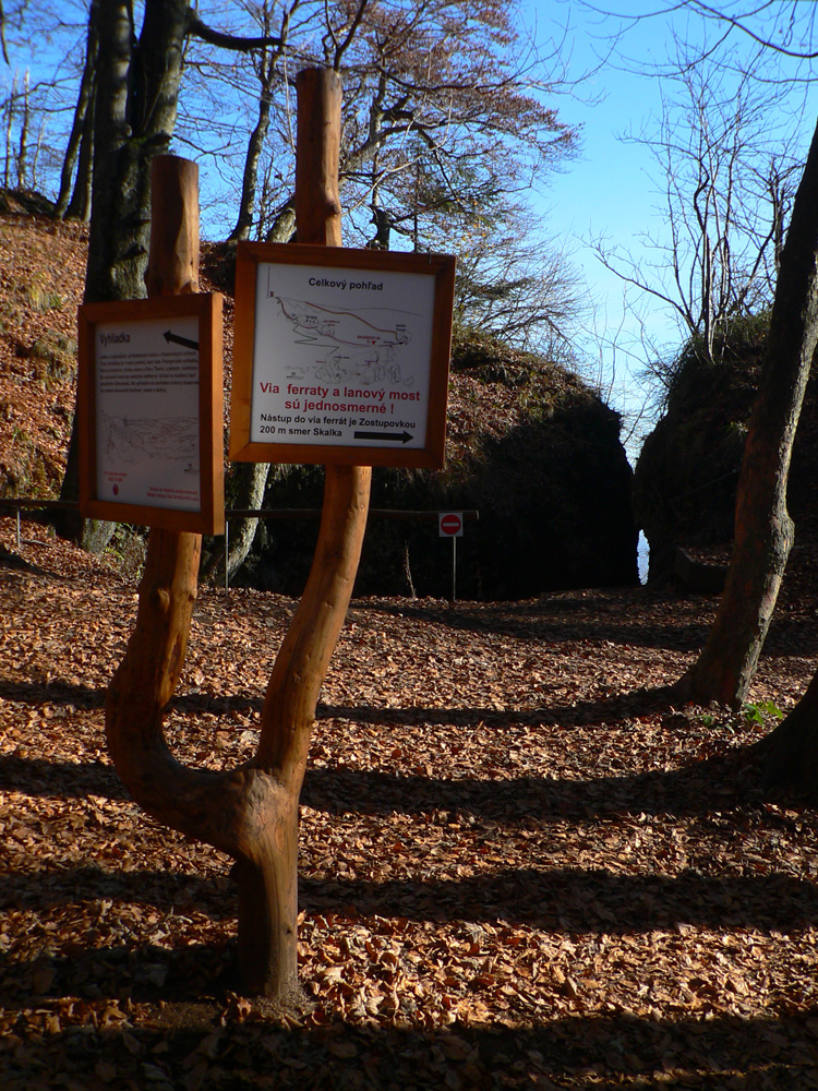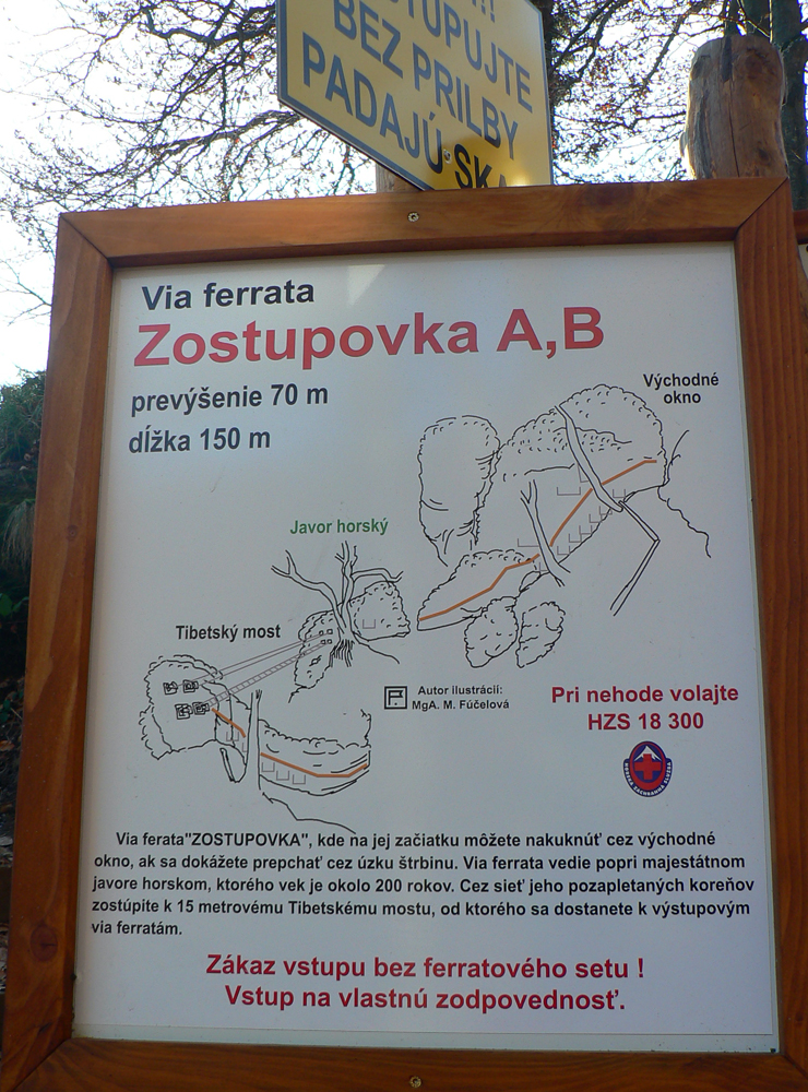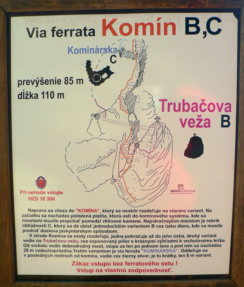 Srandovný je taký dáky politický podtón: Most a Sieť ako najznámejšie tunajšie pojmy :-) Ale je tu aj jedna skutočná Výzva – najťažšia ferrata na Slovensku s reálnou obtiažnosťou E. Najkrajší je ale jednoznačne Komín – pohodový, len miestami asi nič moc pre klaustrofobikov. V ňom je viac možností, kade stúpať: na začiatku po kolmom Rebríku alebo jednoduchším Jaskyniarskym variantom. Potom sa dá odbočiť na vzdušnú Trubačovu vežu s vrcholovým krížom a z nej ujsť „na pevninu“ ďalším adrenalínovým mostom. V závere Komína je ešte možné vyskúšať krátky, ale náročnejší Kominársky variant. Samotný zostup z hrebeňa k Sieti, Výzve a do Komína je poriadne strmý, takže je zaistený samostatnou ferratou (A, B) s Tibetským mostom na jej konci. Priamo na hrebeni je ešte cvičná ferratka Jánošíkova diera a komu by bolo teplo, aj neoznačená (zatiaľ?), ale zaistená puklina plná snehu. Hej, aj po dlhom lete je ho tam ešte dosť! K tomu lavičky a infotabule, všetko ako má byť.