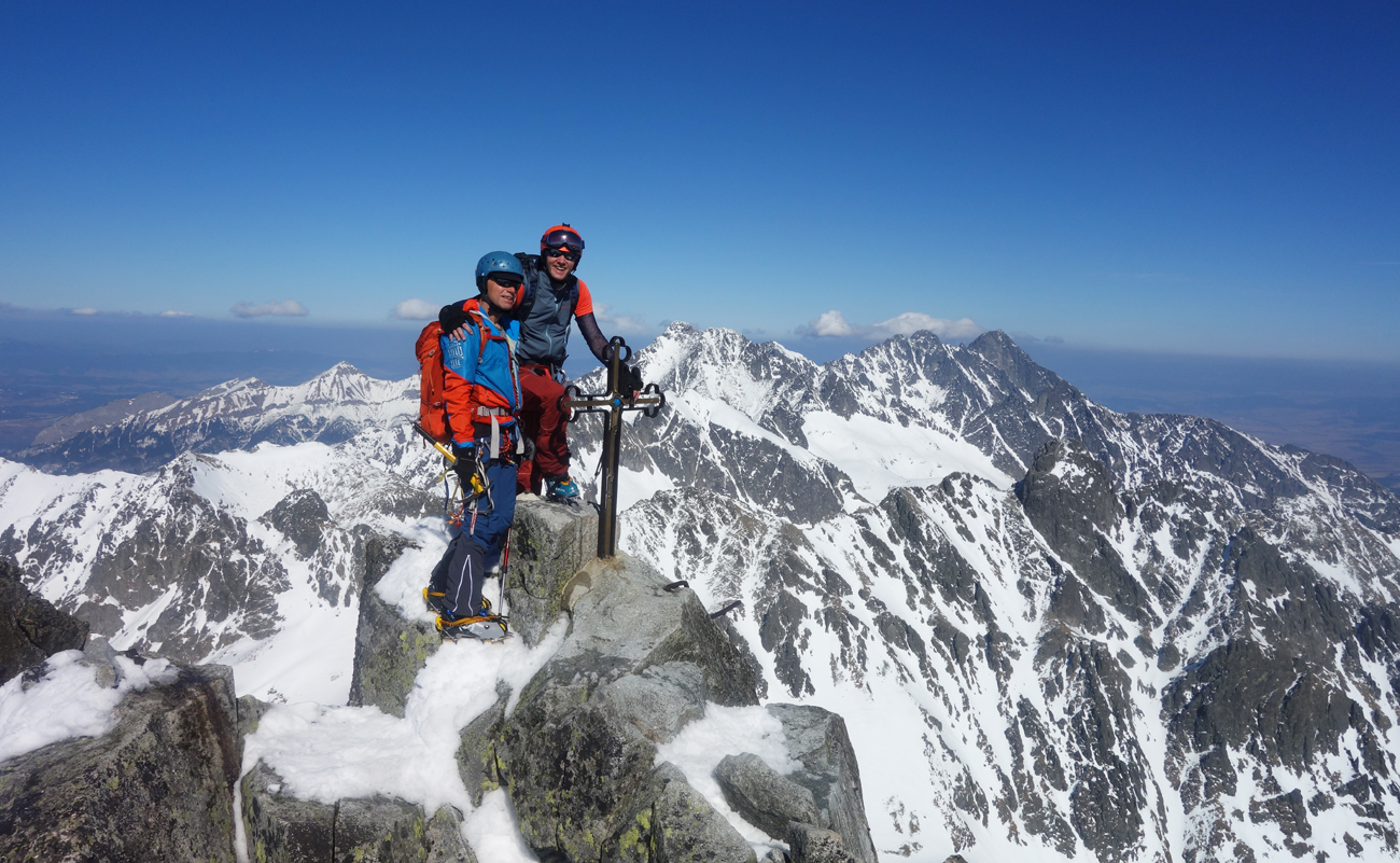Lyže nechávame v malom snehovom sedielku pár metrov pod vrcholom a už naľahko sme 13:15 pri kríži. Som na Gerlachu druhýkrát, lenže prvýkrát v lete nás pri výstupe Velickou dolinou zastihla hmla a boli sme vôbec radi, že sme orientačne náročný výstup zvládli. Pocity teraz sú úplne iné. Krásne pohľady na všetky svetové strany, bezvetrie, jasný smer zostupu, ktorý na lyžiach bude veľmi príjemný a skvelí parťáci, s ktorými všetku tú radosť môžem zdieľať. Sneh už od slnka oťažel, odtopených je miestami aj 10 cm, čo však príjemnej jarnej lyžovačke vôbec nevadí. Po chvíli sme opäť pri próbe. Tu sa však nahromadili skupiny turistov a niektorí česko-poľskí jedinci na nás nepôsobia vôbec koordinovane. Šikovne sa však pomocou lana na trikrát dostaneme na miesto, kde môžeme obuť lyže. Zjazd slnkom zaliatou Batizovskou dolinou je dokonalý. Pri Batizovskom plese traverzujeme na lyžiach do Štôlskej doliny a ešte si doprajeme pár pekných oblúkov na hranici kosodreviny. Krásnou, skoro neznámou dolinou sa napojíme na žltú značku. Lyže vyzúvame 500 m od auta po 1400 výškových metroch zjazdu, krátko pred 16:00.