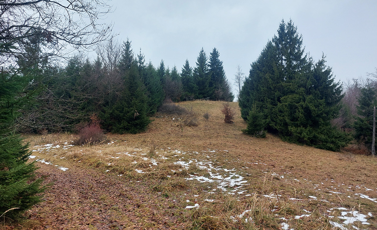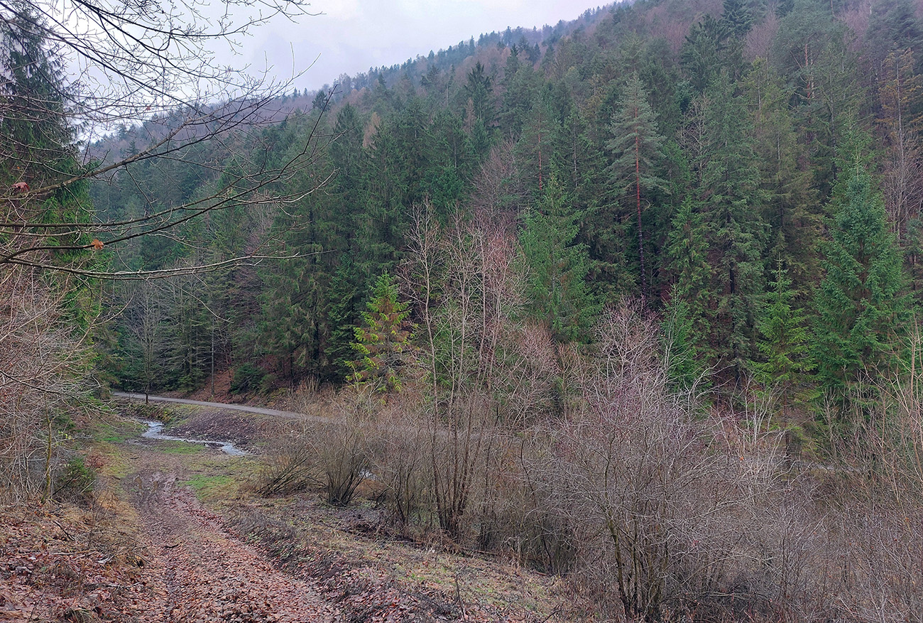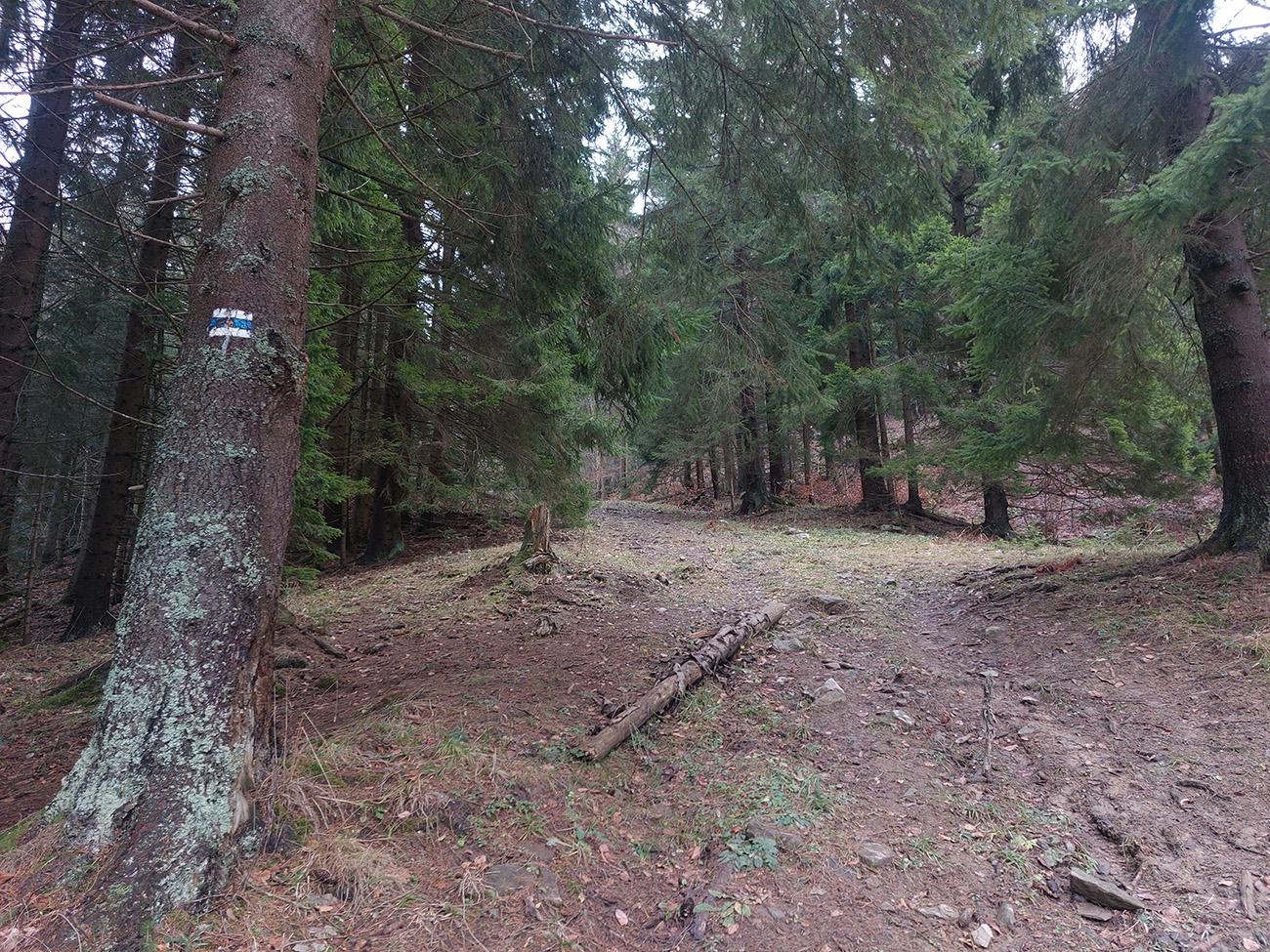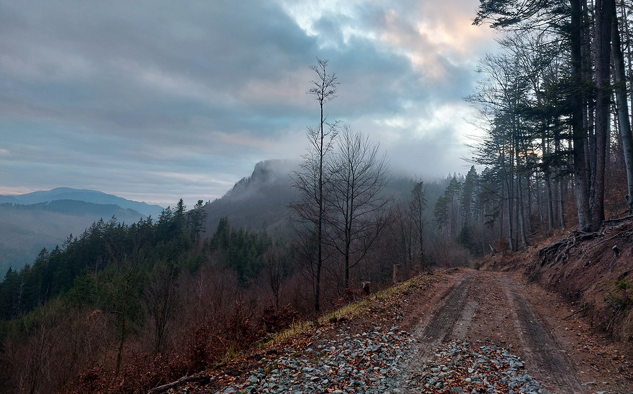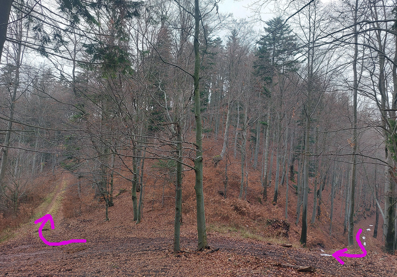 Tak zrýchlený presun dole kopcom k jazierkam Teplických serpentín, po neoficiálnych oranžových značkách, krížom cez rúbane, ale po relatívne jednoznačnom chodníku. Na vyhliadku ku krížu som už ani nešiel, stmievalo sa akosi moc rýchlo pod tou sivou dekou.
