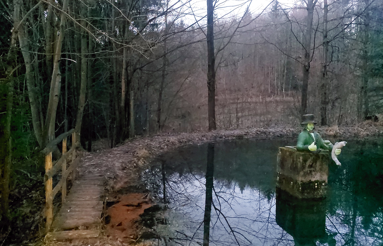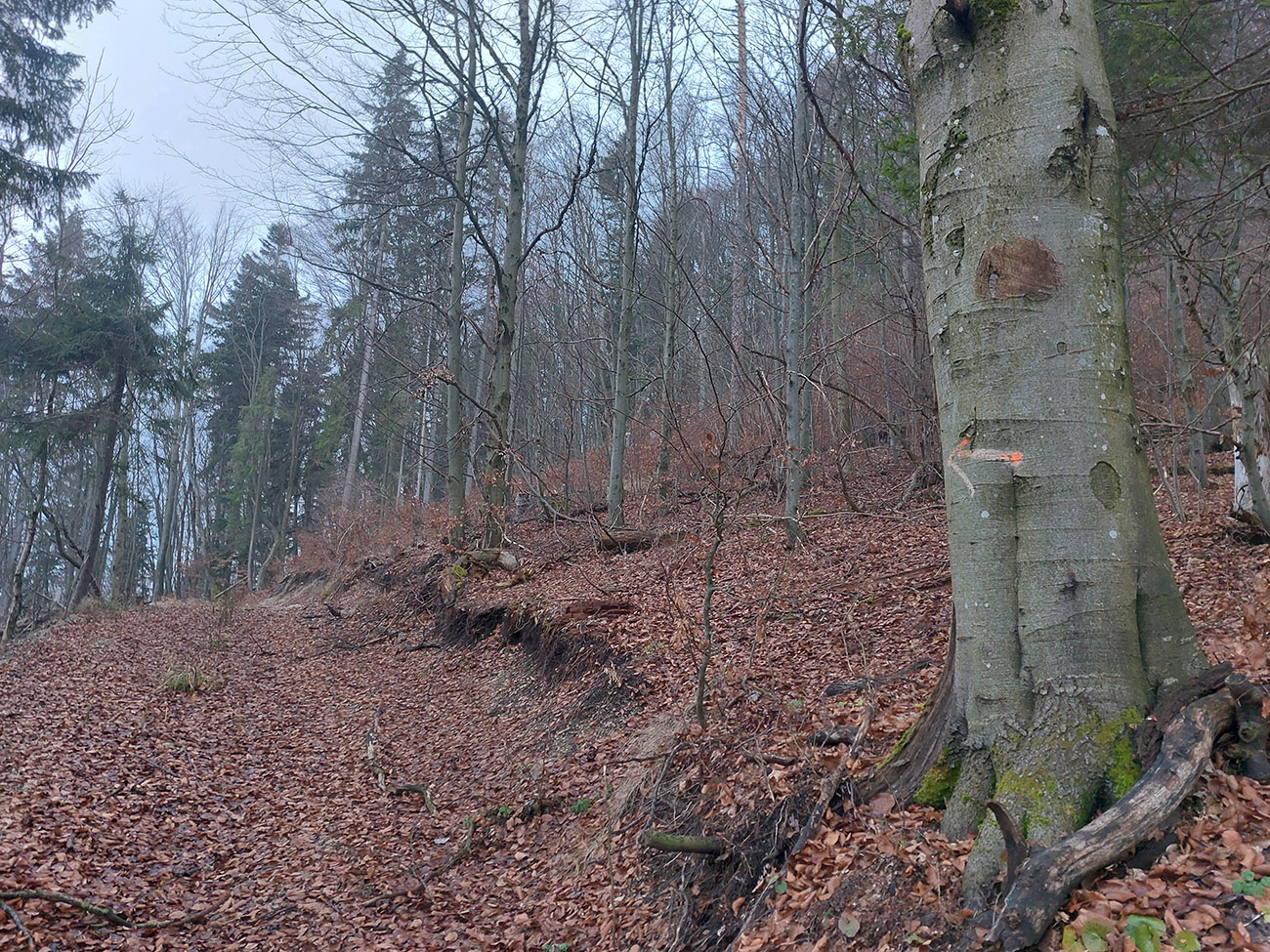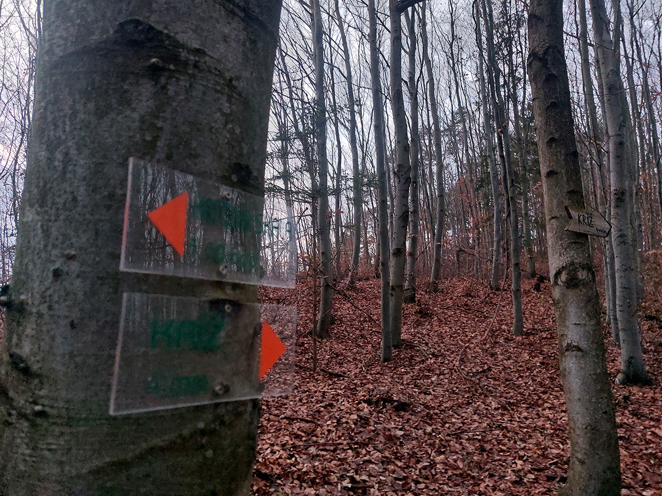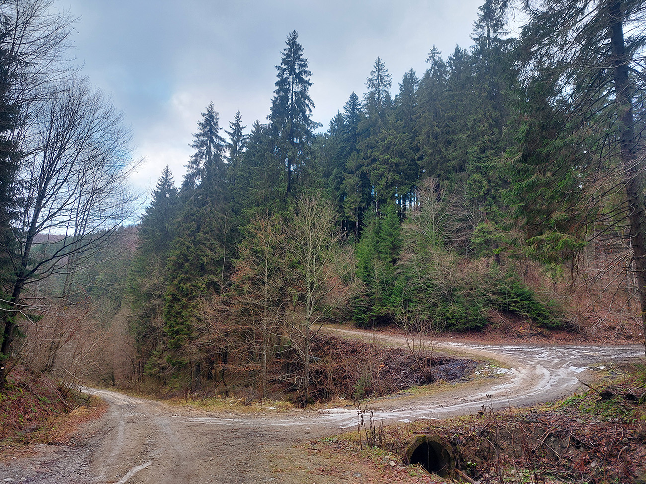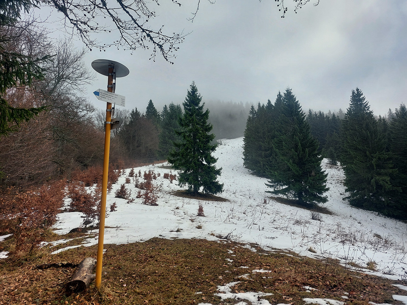 Tak zrýchlený presun dole kopcom k jazierkam Teplických serpentín, po neoficiálnych oranžových značkách, krížom cez rúbane, ale po relatívne jednoznačnom chodníku. Na vyhliadku ku krížu som už ani nešiel, stmievalo sa akosi moc rýchlo pod tou sivou dekou.