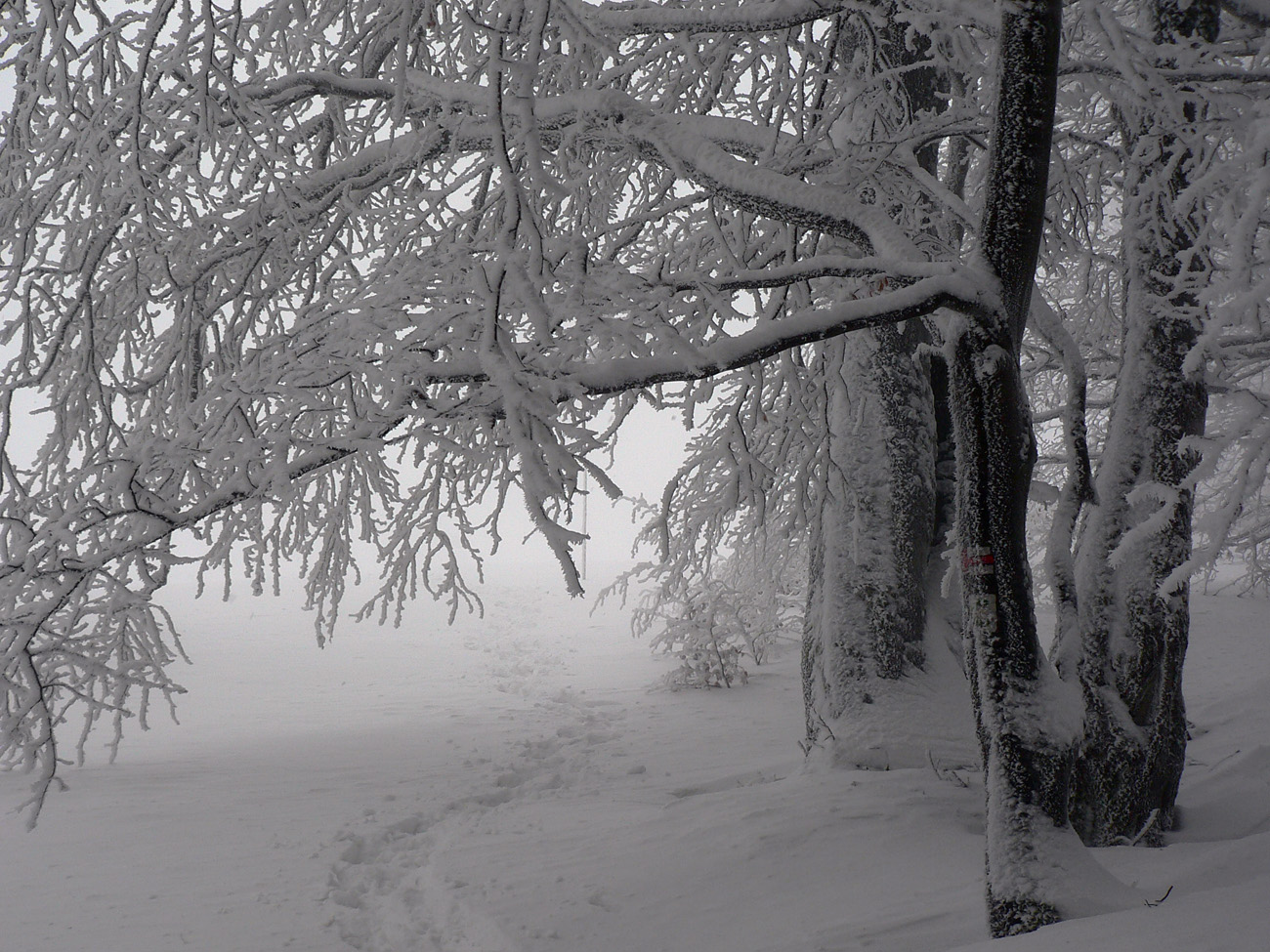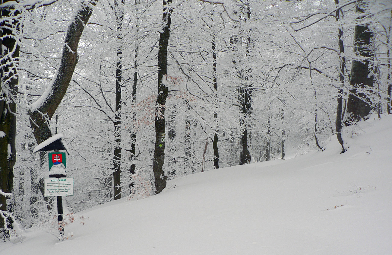 Hore nevidno ničovatô nič, tak cestou aspoň tyče obíjam, ale dáko ich je čoraz menej... Ale stôp požehnane, tak idem po nich. Intuitívne vnímam podľa sklonu terénu, kde asi som, ale že idem aj s tými stopami nejako moc prudko dole a že nejako priskoro som odbočil viac doprava, to mi dochádza, až keď vidím na strome pred sebou zelenú :-) Jáááj, ale do Brusna nechcem!!! Že bude viac stôp týmto smerom ako po hrebeňovke, to by mi veru nenapadlo.