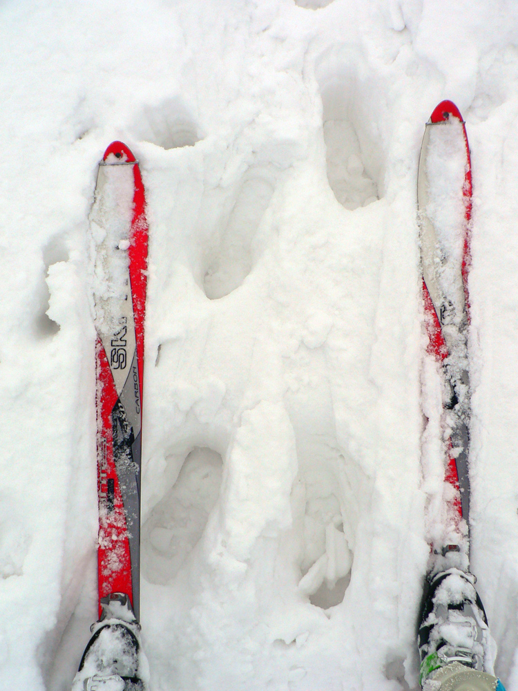 Od Košariska už je to komfort, tyče sú a hlavne: vidno od jednej k druhej :-) Pod Skalkou niekto lyžoval, zrazu mám aj pre lyže stopu, ale teším sa krátko. Spoza stromu najprv pes („Lidi nežere, jenom nechce uhýbat.“), potom päť borcov. Lebo idú na pešo a boria sa po kolená. Vraj sú zvyknutí... Ale ako tá stopa vyzerá... Našťastie kôrka drží, šmýkam povedľa. Spoločnosť mi robí jemný severáčik s arómou ružomberskej celulózky :-)