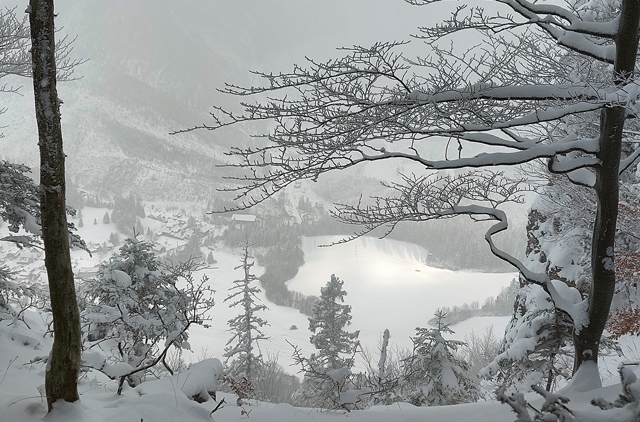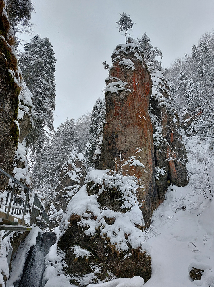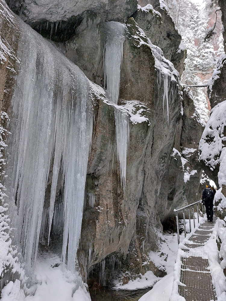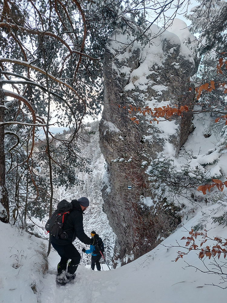 Zostup strmo dole do Tiesňav ešte krajší, ale vďaka tomu čerstvému páperiu bez základu aj šmykľavejší. A často vôbec nevieme, do čoho pod tým snehom stúpame. Retiazky a schodíky ukryté pod perinou moc nepomáhajú, skôr zavadzajú. Ale sivobiela bralnatá krajina naokolo je úchvatná.