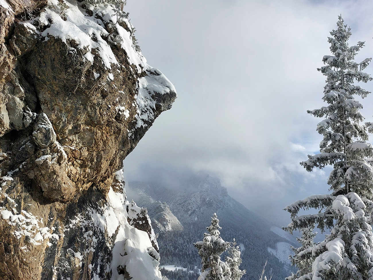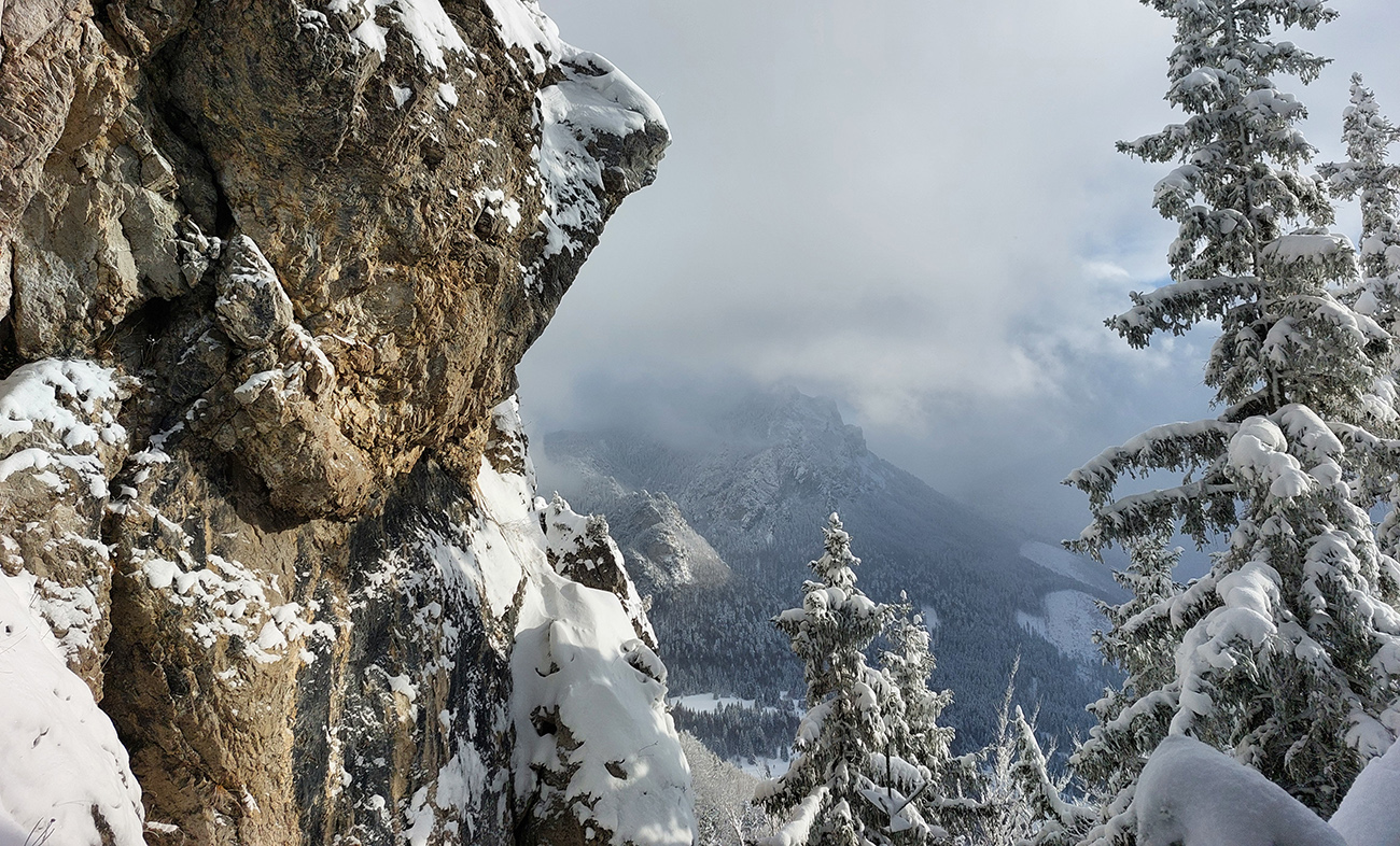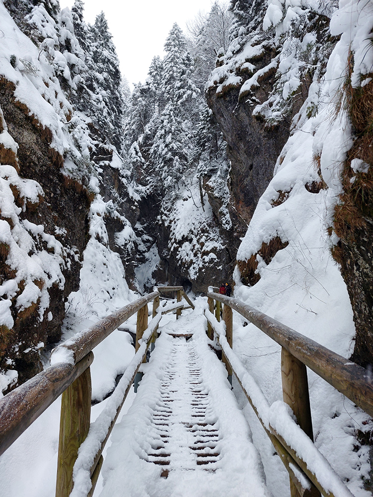 Zostup strmo dole do Tiesňav ešte krajší, ale vďaka tomu čerstvému páperiu bez základu aj šmykľavejší. A často vôbec nevieme, do čoho pod tým snehom stúpame. Retiazky a schodíky ukryté pod perinou moc nepomáhajú, skôr zavadzajú. Ale sivobiela bralnatá krajina naokolo je úchvatná.