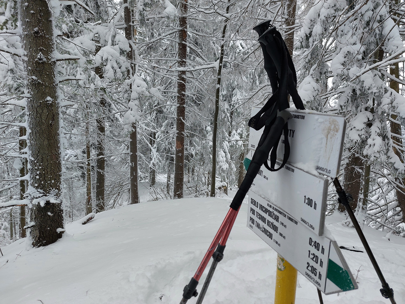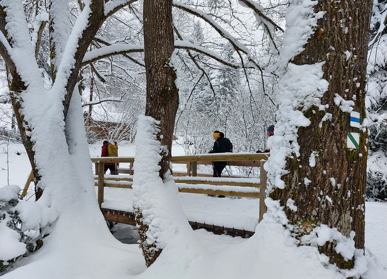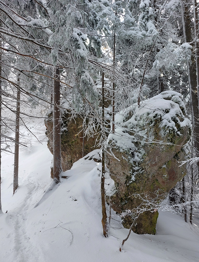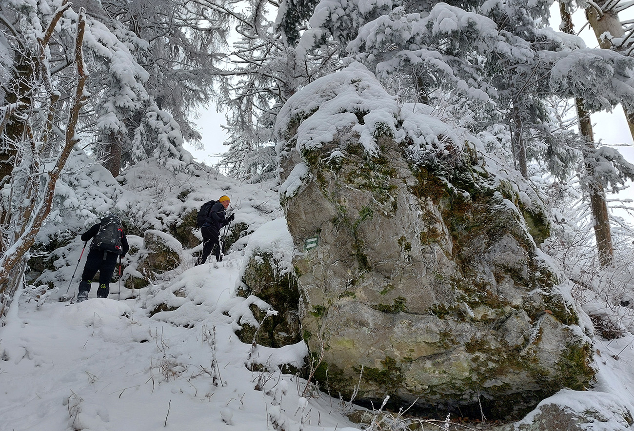 Diery, Boboty, Tiesňavy, Sokolie, Obšívanka – klasické turistické ciele nad Terchovou a pekne v tomto poradí. Atraktívne svojou krásou, všeobecne známe, a preto väčšinou plné turistov. Lenže nastalo novoročné ráno, keď sa všetky penzióny a priváty len veeeľmi pozvoľna prebúdzali zo silvestrovského žúrovania. Navyše teplota jemne pod nulou, na zemi (aj na neodhrnutých chodníkoch samozrejme) tak do 20 cm čerstvého snehu, ktorý navyše dopoludnia stále jemne pribúdal. To bolo treba využiť, lebo skúsenosti hovorili, že bude ľudoprázdno. Takže na nohy hrubé boty, na boty štucne (niektorí) a išlo sa. Necelých 13 km a necelý kilák prevýšenia, ale podceňovať tie technické preliezačky netreba, v strminách je postup vždy pomalý a samozrejme čerstvý sneh ho teraz ešte viac komplikoval. Častokrát sme veľmi nevideli, do čoho stúpame. Ale ideálna voľba do počasia, keď nad lesom fučí severák a nič tam nevidno. Takto teda sme to zokruhovali, podľa Mapy.com: