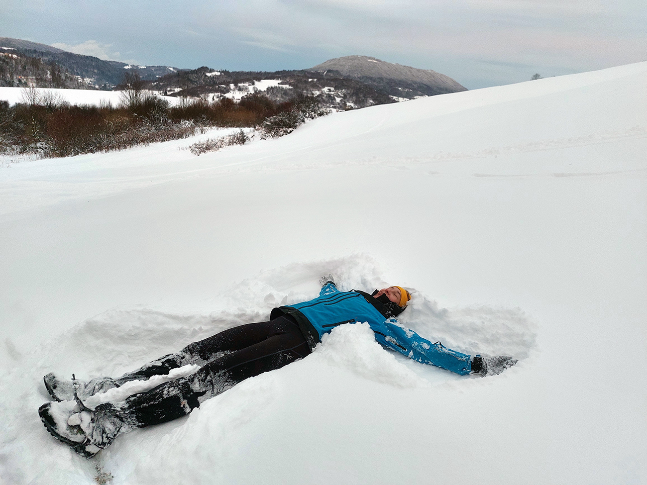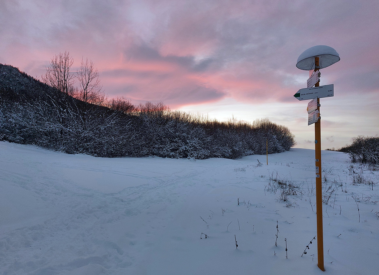 Potom už len popri potoku na lúky nad Terchovou a stíhame to presne: slnko nám za chrbtami akurát maľuje horizont na červeno a pochod pomedzi terchovské chalúpky je taký romantikuš snehovo – osvetielkovaný v tom hustnúcom šere. Ako bonus si každý nesieme aj trochu lesného snehu za golierom, lebo každý si aspoň raz nedal cestou pozor na nízko visiaci, snehom obťažkaný konár. Výýýýborne bolo, vďaka partii za skvelý nápad! Viac takých dní!