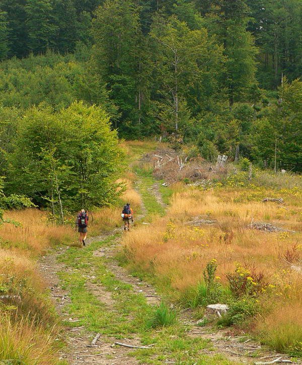 Ideme červenou Rudnou magistrálou. Kúsok po pasienkoch, okolo kravína na Uhliarke, ale potom už väčšinou lesom. Huby rastú ako po daždi, dubáky a plávky nám z ihličia mávajú. Mierne stúpajúcou zvážnicou v lese (zas tie maliny!) sa dostávame do sedla Tri chotáre, pokračujeme cez Šopisko striedavo lúkami a lesom. Chodník vedie po širokom hrebeni a popri ňom často vidieť hromady kameňov. Povyvážali ich sem asi gazdovia, ktorí dakedy dávno premieňali les na polia a pasienky. Dnes sa sem les znovu vracia.