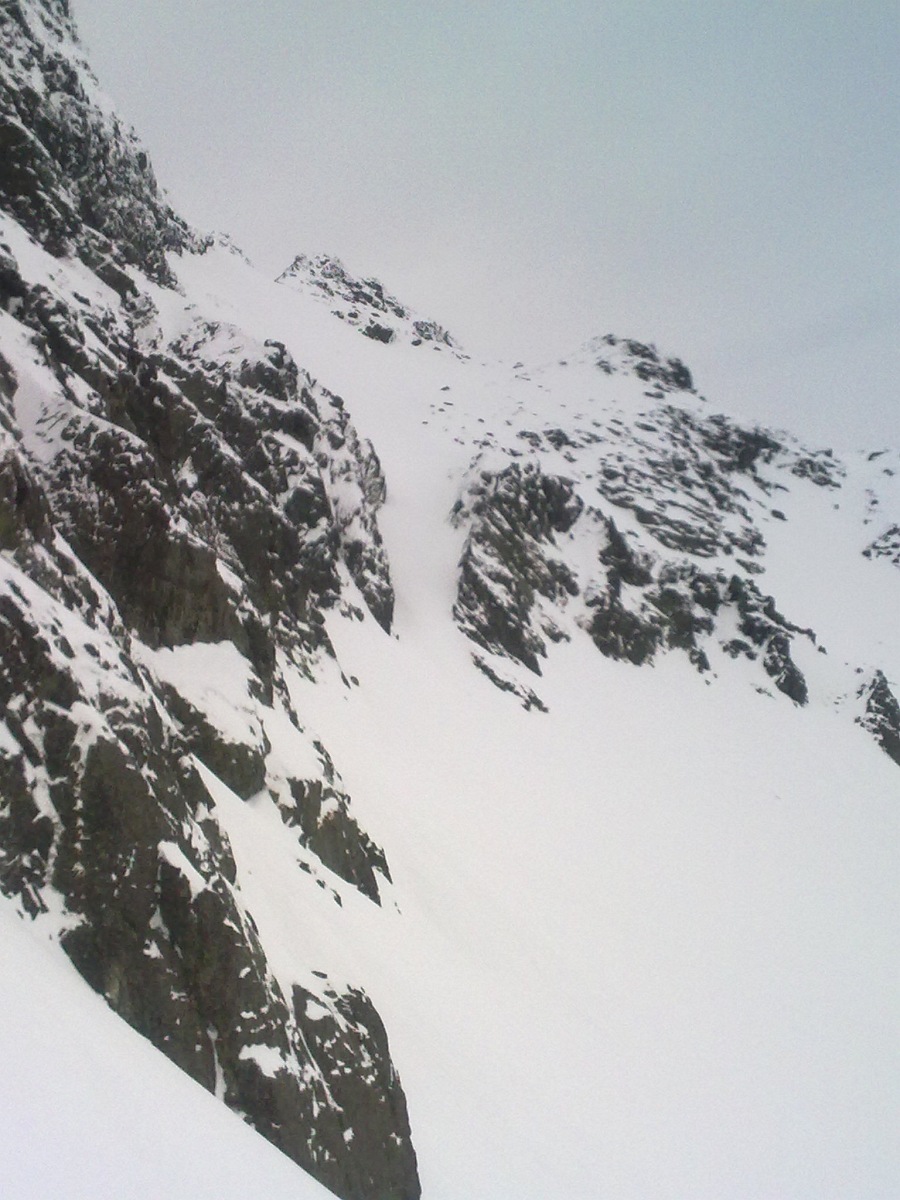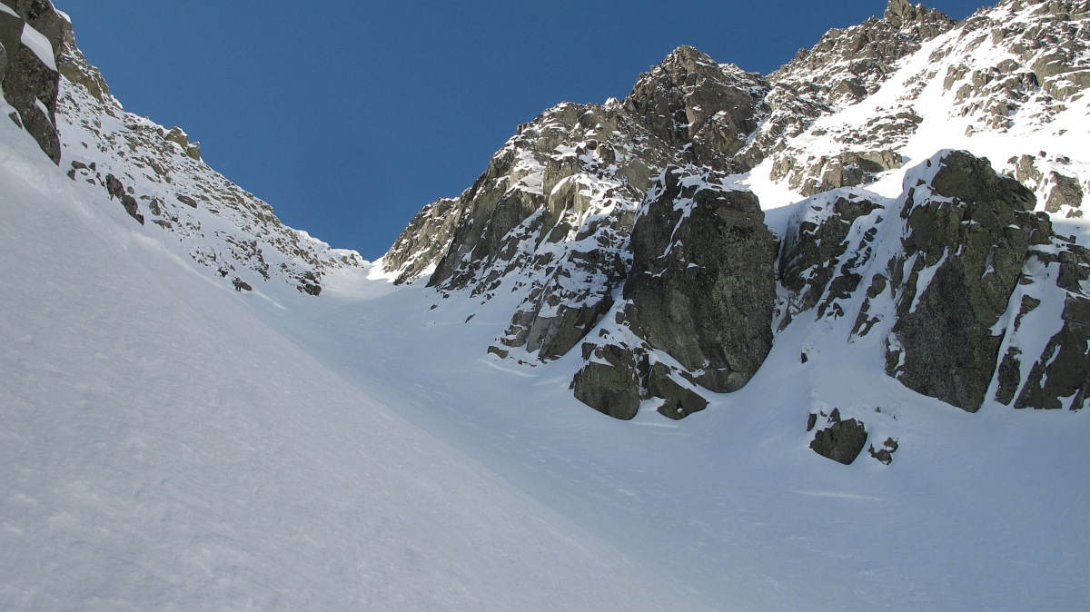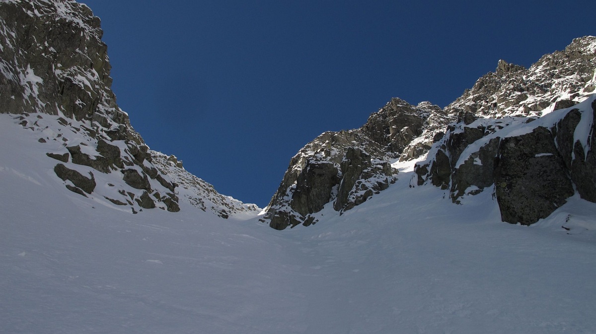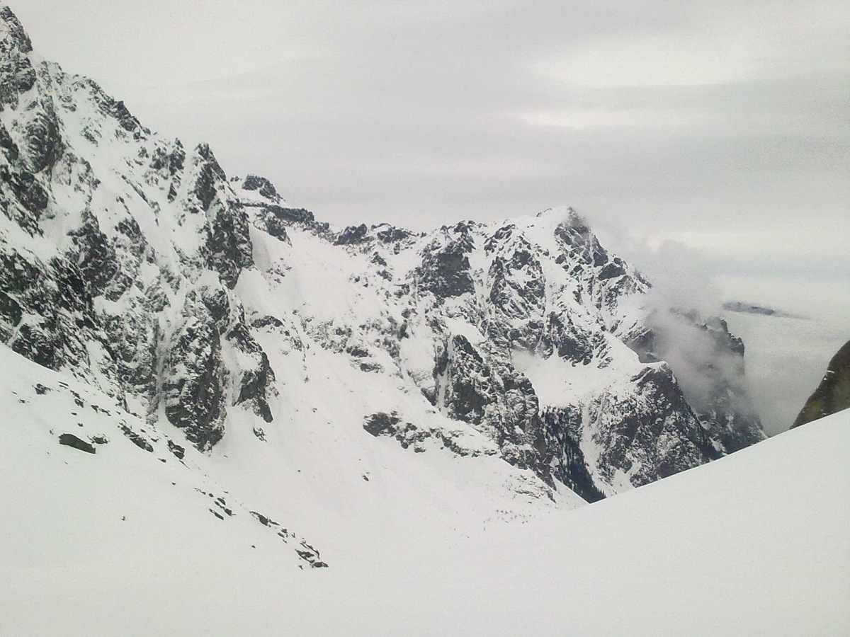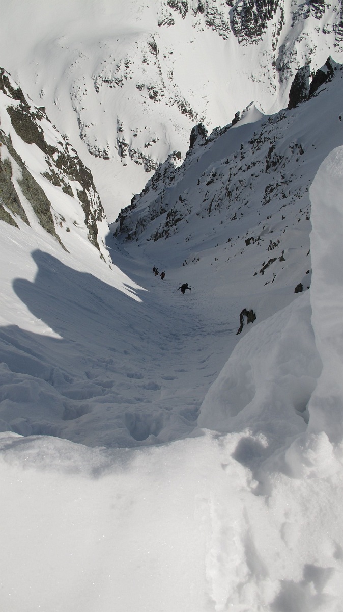 Na Sliezskom dome pozeráme, ako sa za nami pomaličky hmla plazí hore, ale vyzerá to ešte na dlhšie. Super, viditeľnosť by mala byť dobrá. Začíname šliapať, sneh je na počudovanie vo výbornom stave. Je tvrdo, ale nie ľadovo. V doline, nad Večným dažďom už pomaly obzeráme, čo všetko by sa cez vikend mohlo opáčiť. V späťákoch sa začína objavovať hmla, kým sa stihneme otočiť, že čo sa deje, tak už nevidno ništ. "Tak toto som ešte nezažil", kukám na Peťa, ten tiež ešte neverí vlastným očiam. Tak, radosť znova predčasná. Tipujeme, kade asi ďalej do doliny, vidno je tak po špičky lyží. Pri nástupe do Krčmárovho žľabu sa hmla zázračne rozostúpi, skoro ako v rozprávke. A my obzeráme, akože vyzerá prah v strede žľabu. Dobre, skoro ho tam ani nevidno. Sneh tiež výborný, nuž čo, také podmienky nebývajú často... Ide sa. Keď bude zle, otočíme. Šliape sa dobre, výškové metre pribúdajú a sneh je lepší, čím vyššie sa ide. Za chvíľu sme hore v sedle a obúvame sa na zjazd. Začíname lyžovať, hmla tiež začína svoj triumfálny návrat.