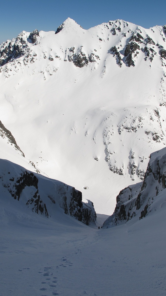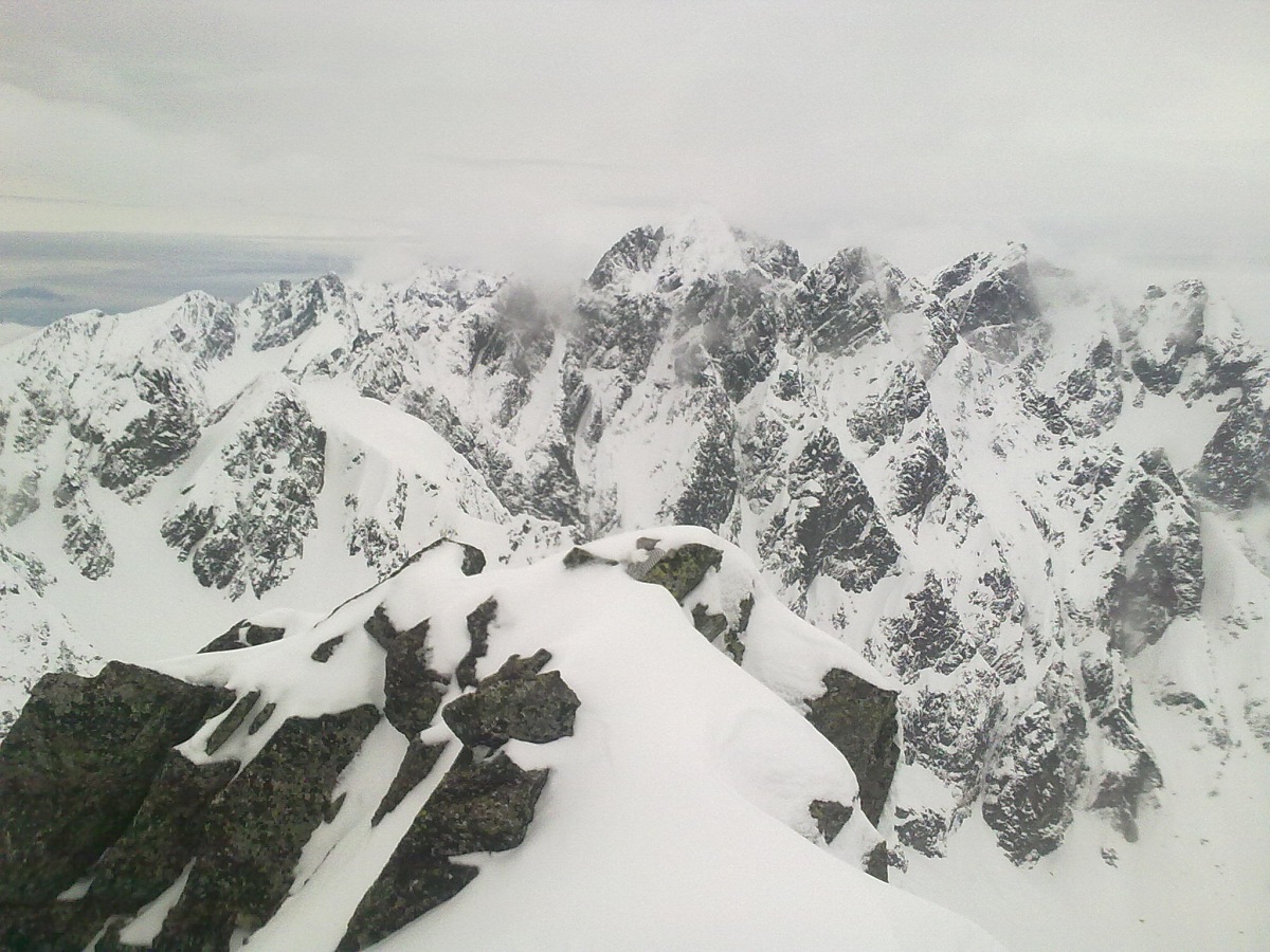 Je to ako pri dákom koncerte. Nikde nič, zrazu majster stlačí dáky gombík a nevidíš na kapelu. No čo už, nad sklonom sa tým pádom už prestávame zamýšľať a lyžujeme oblúk za oblúkom. Lyžovačka je napriek tomu výborná, ešte keby sme tak vedeli, kde vlastne sme. Neva, prah už dajako zbadáme. Nižšie už hmla neni taká hustá a tak aj tento problém odpadá. Prahom prechádzame bez tažkostí, zvyšok lyžovačky už je lahôdka. Dole dávame krátky oddych a pristupujeme k pôvodnému cieľu dňa, výstupu do Litvorového sedla. Výšľap sme poňali trocha priamočiarejšie, nie smerom na Poľský hrebeň, ako je normálne, a tak to ubehne rýchlo. V sedle vyťahujem čakan a oznamujem Peťovi že si ešte zbehnem na štít. "To je za chvíľu", hovorím. Po chvíľke šliapania a obliezania skál mi tá chvíľa aj príde dlhšia ako som čakal. Na štíte musím trocha predýchať, pohľad však stojí za to. Obzerám si moje obľúbené časti Tatier: Kačacia dolina, Zlobivá, Mlynár, Vysoká... Je to pekné, možno preto že to nemám také okukané. Zbehnem dole a ideme s Peťom ešte pozrieť, ako vyzerá zjazd do Kačacej doliny. Tiež jeden z dalších plánov. Po prvých krokoch to vyzerá na kúšťok prašanu a tak začíname premýšľat. Lyžovanie isto lepšie ako na Sliezsky dom, len ten výšľap do Železnej brány. Nakoniec zvíťazí chuť na dobrú lyžovačku a tak ideme na to. Lyžovanie fakt stojí za to, užívame si najlepšiu lyžovačku dňa. Oplatilo sa, zastavíme trocha povyššie Gerlachovských spádov a začína výšľap do Železnej brány. Ideme už tak pomalšie, často stojíme, chýba kondička. "Aspoň raz v živote mať takú kondičku ako Vetroplach", pomyslím si. Ale tú Železnú bránu už dajako dáme, ušetrili sme predsa výšľap na Sliezsky dom. Mne však vŕta v hlave iné: ako sa dostaneme späť k autu v Tatranskej Polianke? Električkou z Popradského sa mi bars nechce... Boh vie kedy zase dáku chytíme.