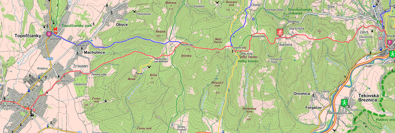 Alebo zo Zlatých Moraviec do Novej Bane, alebo začiatok Rudnej magistrály. Takže červená značka, takých 27 km, dá sa za deň. Do polovice stúpanie na Inovec, potom klesanie. Jednoduché, jasné a krajinársky pekné. A aj dobre značené, čo treba oceniť najmä na rozľahlých lúkach. Svahy mierne, takže je to aj na 100% bajkovateľné, v oboch smeroch. Aj keď v smere od Novej Bane by som volil radšej cyklotrasu, aspoň na začiatku, po Bukovinu. Turistická značka sa z mesta (od Záhrbu) dvíha trochu strmšie, ako je pre bajkera komfortné.