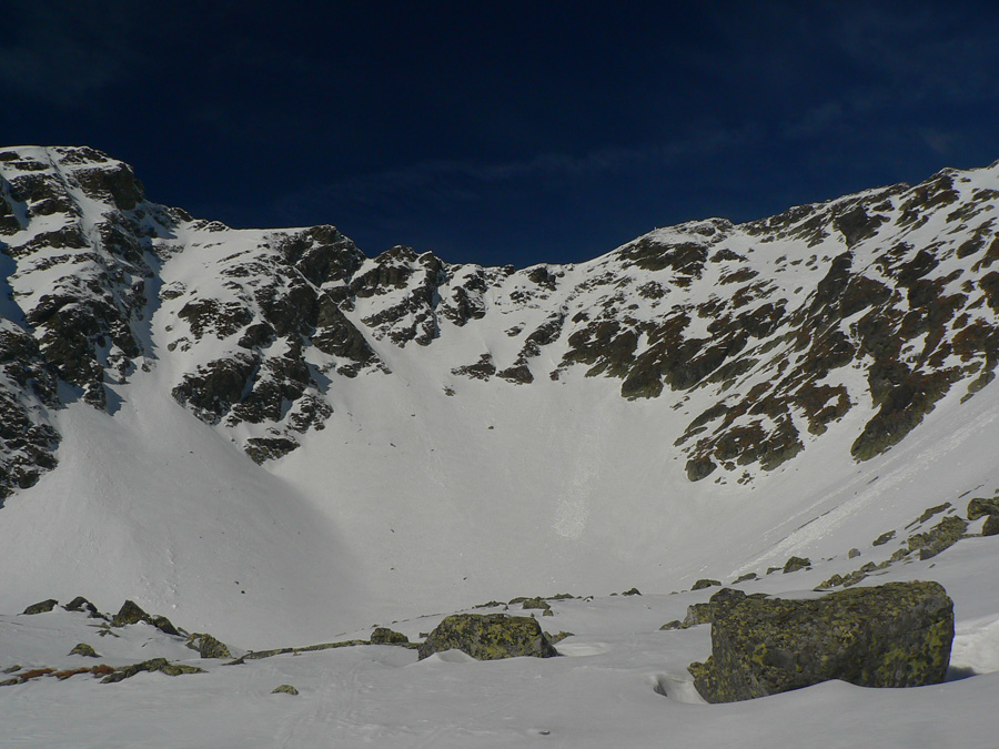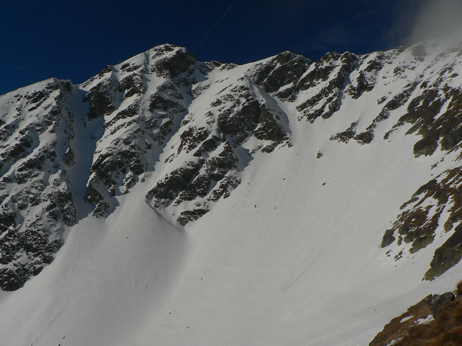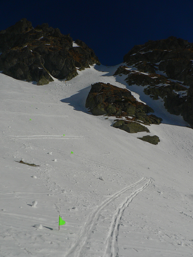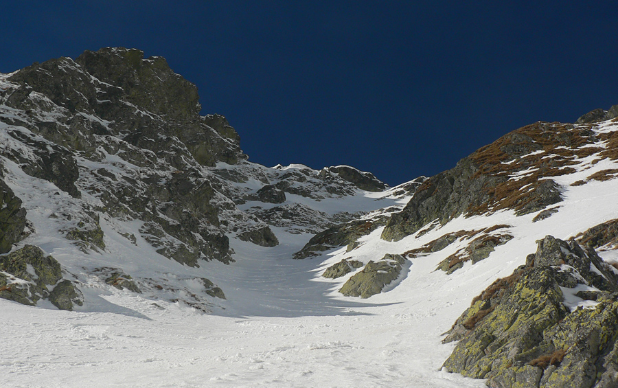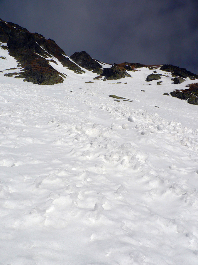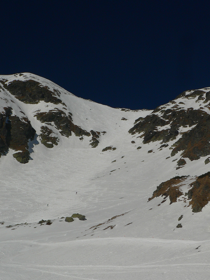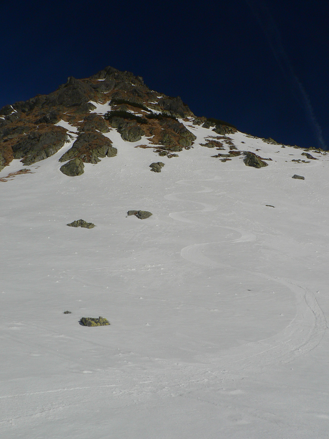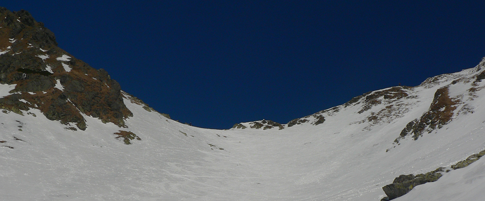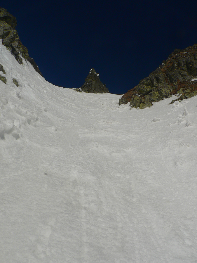 Smola: zároveň so mnou vyliezol do sedla zo severu hustý mrak, po hrebeni na Baníkov sa mi odnechcelo. Či sa dá zlyžovať žľab pod Baníkovskou ihlou, zhora nebolo vidieť, tak som to do Baníkovského kotla vzal okľukou a tam som začal špekulovať, ktorým žľabom hore. Kubov celý v tieni a zamrznutý na kosť, susedný Ypsilon vyzeral príjemnejšie. Ale: v tieni prašan a tvrdo, na slnku prehnitô a riedkô, niekde aj dobre po kolená, pod tým starý základ a spojené to nebolo ktovieako.