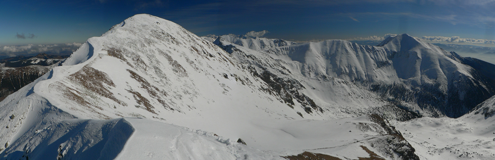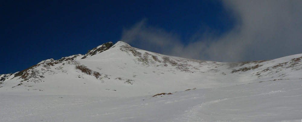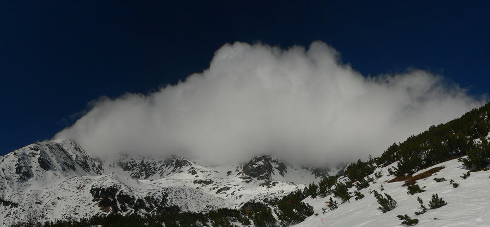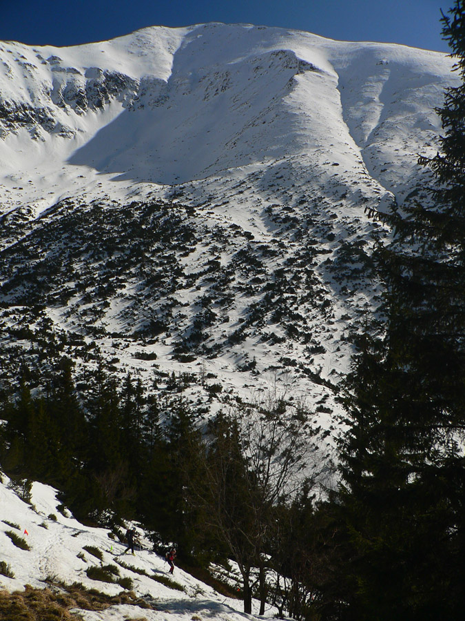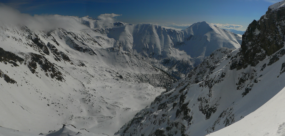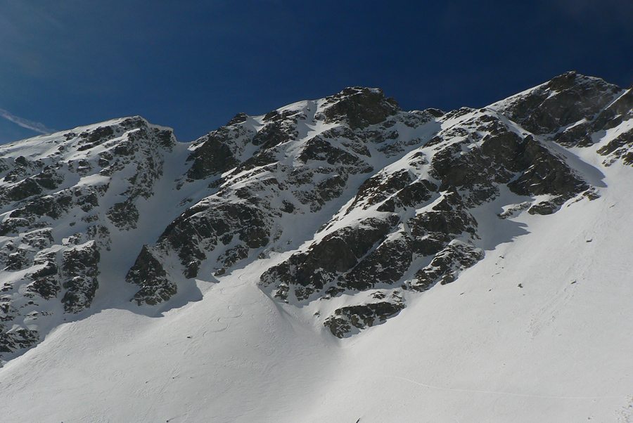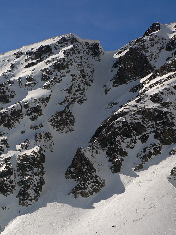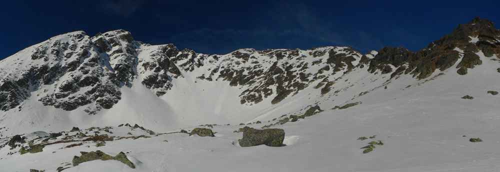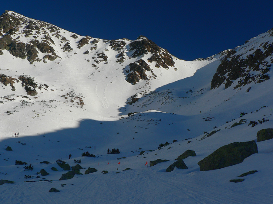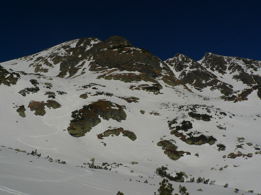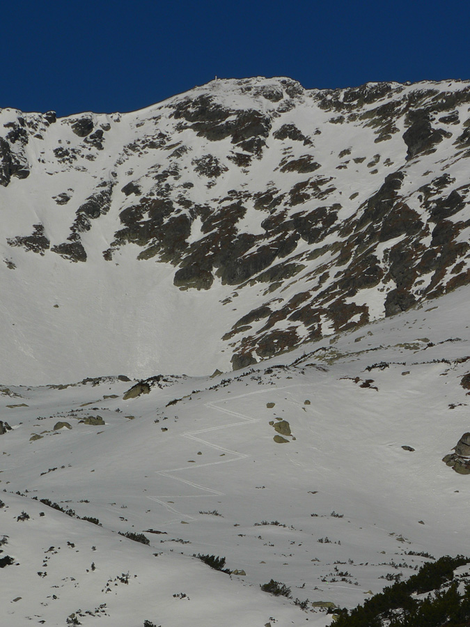 Smola: zároveň so mnou vyliezol do sedla zo severu hustý mrak, po hrebeni na Baníkov sa mi odnechcelo. Či sa dá zlyžovať žľab pod Baníkovskou ihlou, zhora nebolo vidieť, tak som to do Baníkovského kotla vzal okľukou a tam som začal špekulovať, ktorým žľabom hore. Kubov celý v tieni a zamrznutý na kosť, susedný Ypsilon vyzeral príjemnejšie. Ale: v tieni prašan a tvrdo, na slnku prehnitô a riedkô, niekde aj dobre po kolená, pod tým starý základ a spojené to nebolo ktovieako.