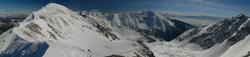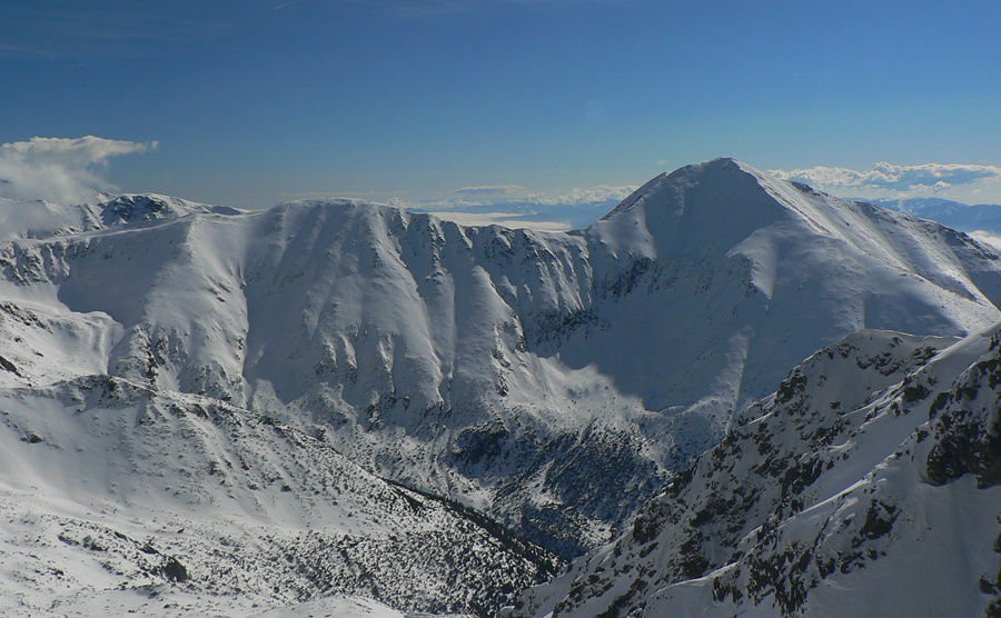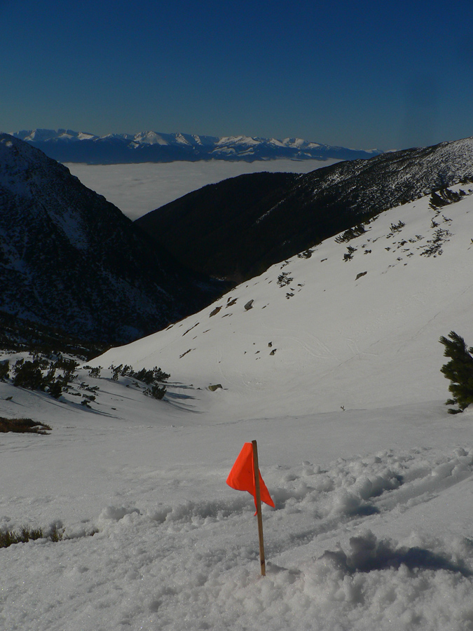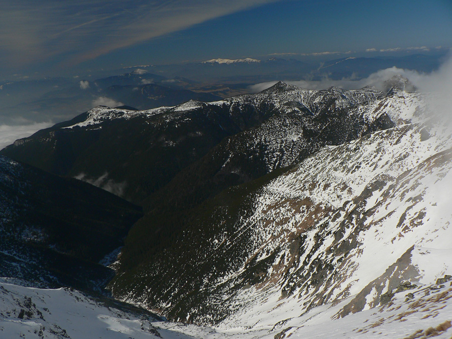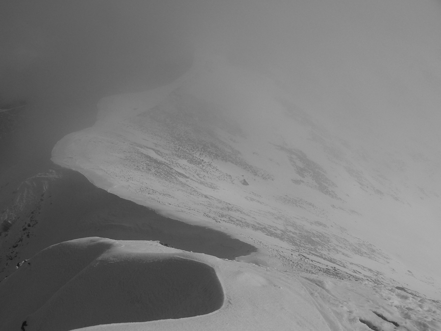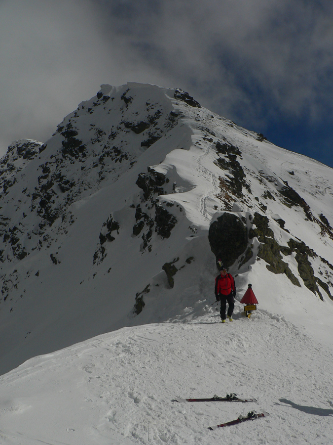 Vyšiel som teda dáko po biede na hrebeň a čo sa asi tak stalo? Ďalší mrak! Do kelu, pred chvíľou ten Baníkov bolo vidieť! Tak aspoň pohľad cez Parichvost na západ a zas dolu po vlastných stopách do kotla. Tam dolu zas dilema: kam ďalej? Južné žľaby riadne prehnité, ale ten spod ihly je prečistený staršou lavínkou, tak sa hádam nebudem po pás do firnu boriť...