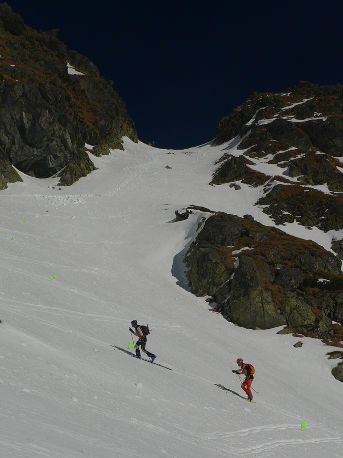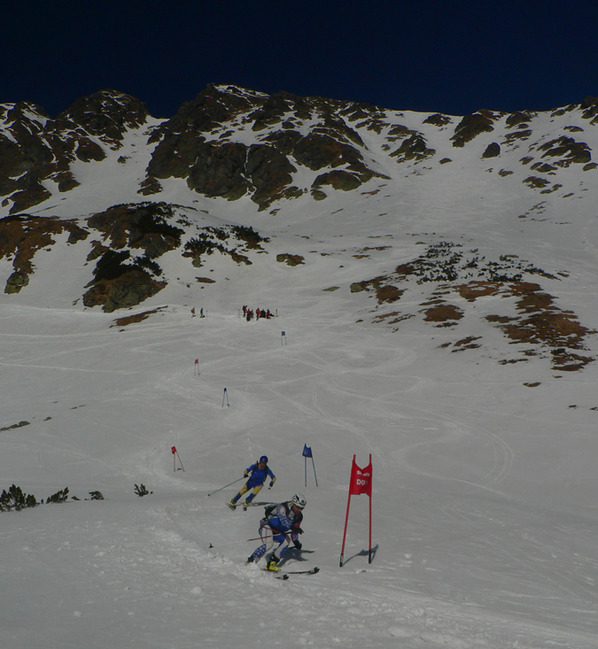 Predpoklad bol správny, len pod zúžením to bolo hlbšie, miestami "vajcové". Takže druhý raz nad Lúčnym sedlom. Pohľad na hodinky, koľko ešte ostáva do odchodu autobusu a zas dilema kam teraz? Neostávalo veľa času, tak štrikovačka pomedzi šutre (ale na voľných plochách sa dali celkom príjemné oblúčiky v tom mokrom firne točiť), nižšie pomedzi pretekárov, ktorí akurát odštartovali do časovky pod Hrubú kopu, ešte nižšie pomedzi pretekárov v obráku :-)
