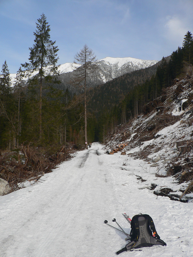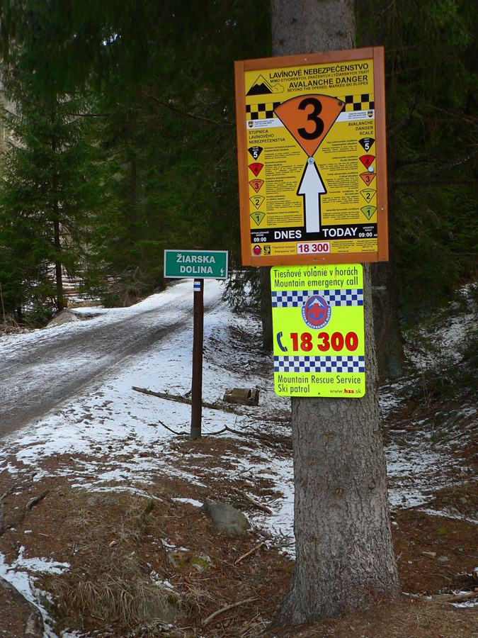 Tak zas po týždni pri rampe do doliny a pozerám: dáka novinka! Na strome veľká žltá tabuľa a na nej veľká trojka – akože lavínová. Nóoo, prituhlo, na to posnežilo, dosť fúkalo, uvidíme. Obuť do lyží sa dá zas na prvom kilometri, ale nad chatami pri studničke treba asi 200m preniesť. Inak vyleštený tvrdý sneh na ceste, nad chatou tiež komfortná stopa, konečne sa raz dobre stúpa. Dnešné moje ihrisko vidím ako na dlani: