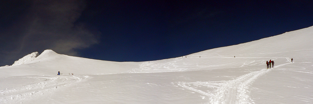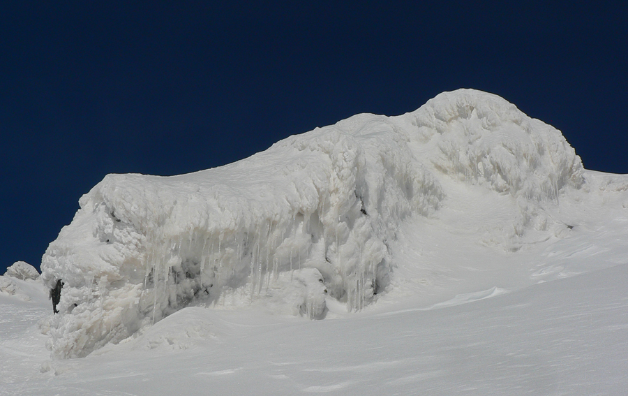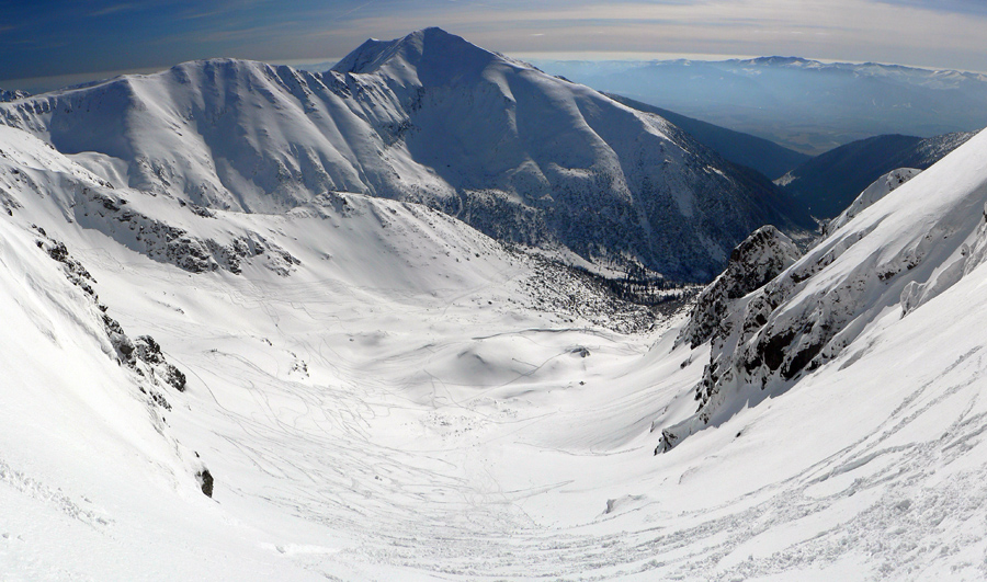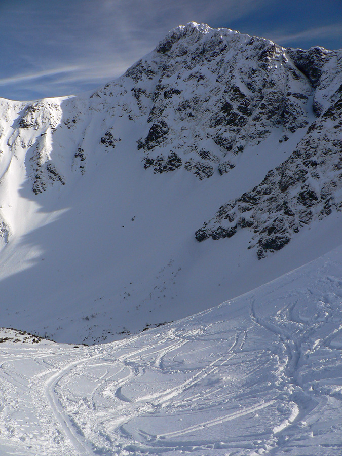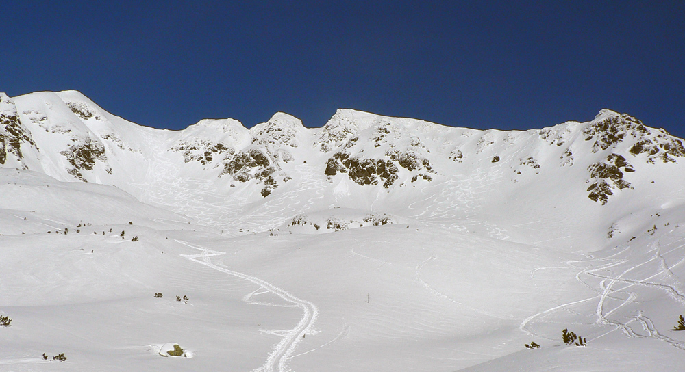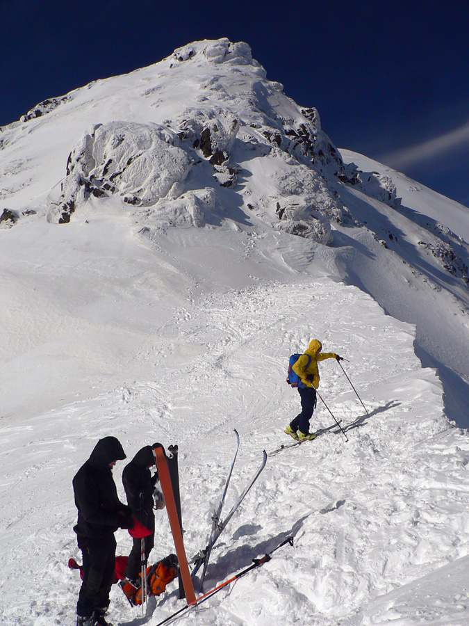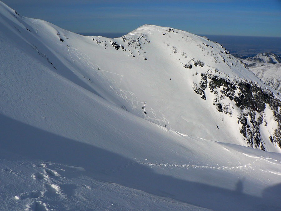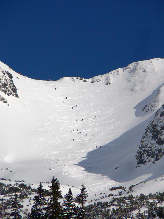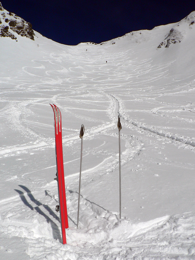 Zjazd jej východným, širokým ani nie žľabom je takýto: hore pár oblúkov po ľade, potom pár v prašane, ktorý smerom dole hustne a začína lyže chytať. Ešte nižšie je to už ťažké a vlhké, nič pre moje voľné lyžiarky a úzke doštičky.