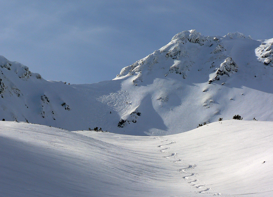 Obedná pauza na dva rohlíky, na slniečku, sledujem čierne mravce, ako lezú na Volovec. A už stúpam po hrebienku ponad dolinu nazad na Kopy. Aj tu je komfortná stopa, len úplne hore vydretá do ľadu, na haršajzne by to bolo miestami, ale ruky aj postačia... Čas ma začína tlačiť, tak nejdem po hrebienku až na hlavný hrebeň, to by som musel dlho pešovať. Traverznem kotol záveru Smutnej doliny, čo najbližšie pod Smutné sedlo. Posledných pár metrov, keď už je traverz príliš strmý a ľadový, vynesiem lyže kolmo hore. Niekde do stredu hrebeňa medzi Smutným sedlom a Prvou kopou.