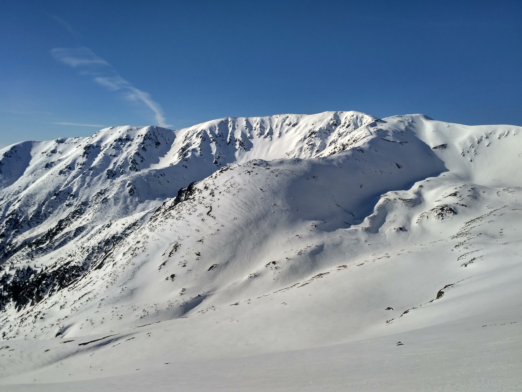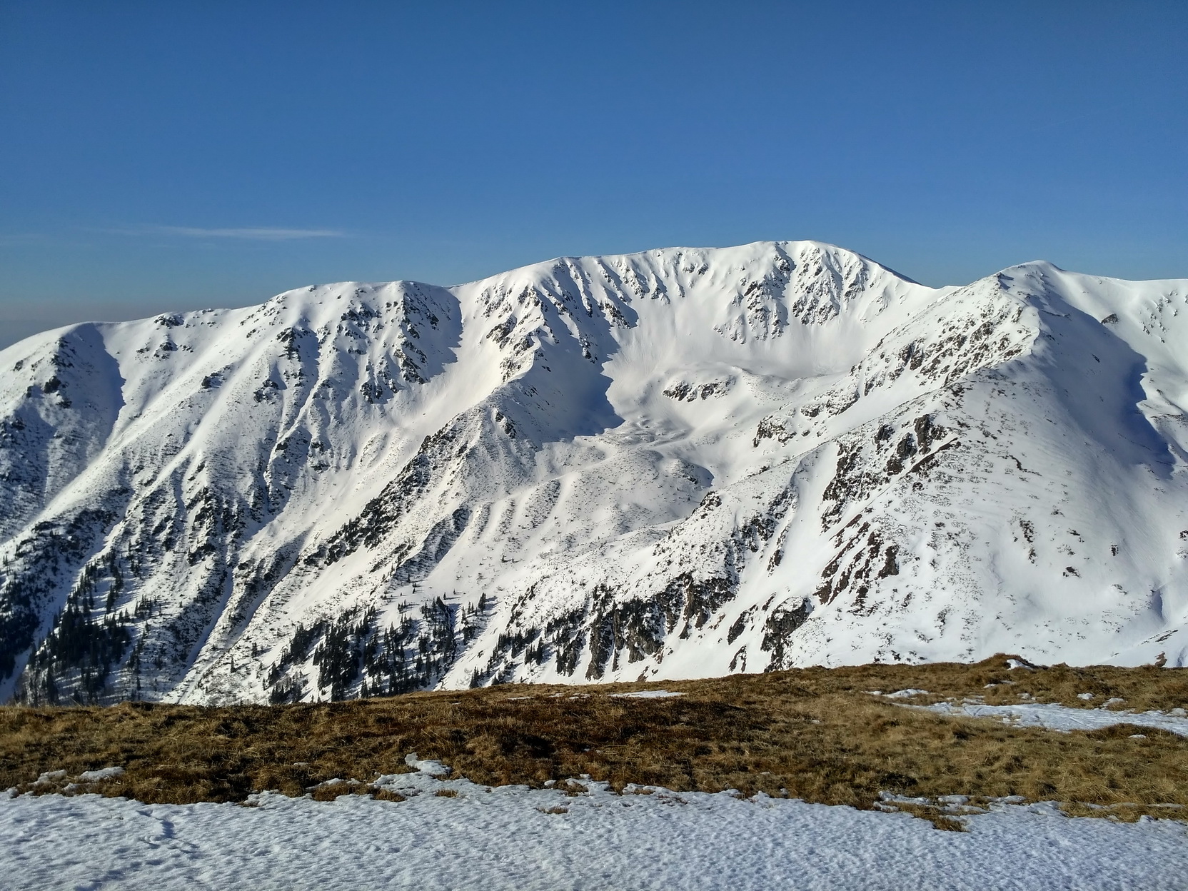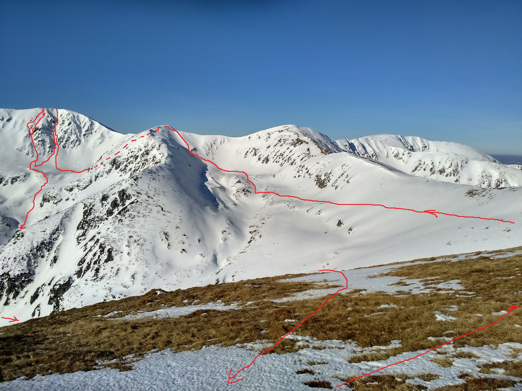 Tretí pokus vyzerá nádejne. Fičíme štandardne z Magurky cez Chabenec. Je krásny slnečný deň, snehu je v línii dosť a hlavne je spravený. Ani vrcholový prevej nie je zbytočne nazdúvaný. Pofukuje však, čo je problém, lebo zostáva tvrdo a nárok nakoniec majú iba južné kolmo nasvietené pláne. Chlad chlad stále samý chlad - 0:3