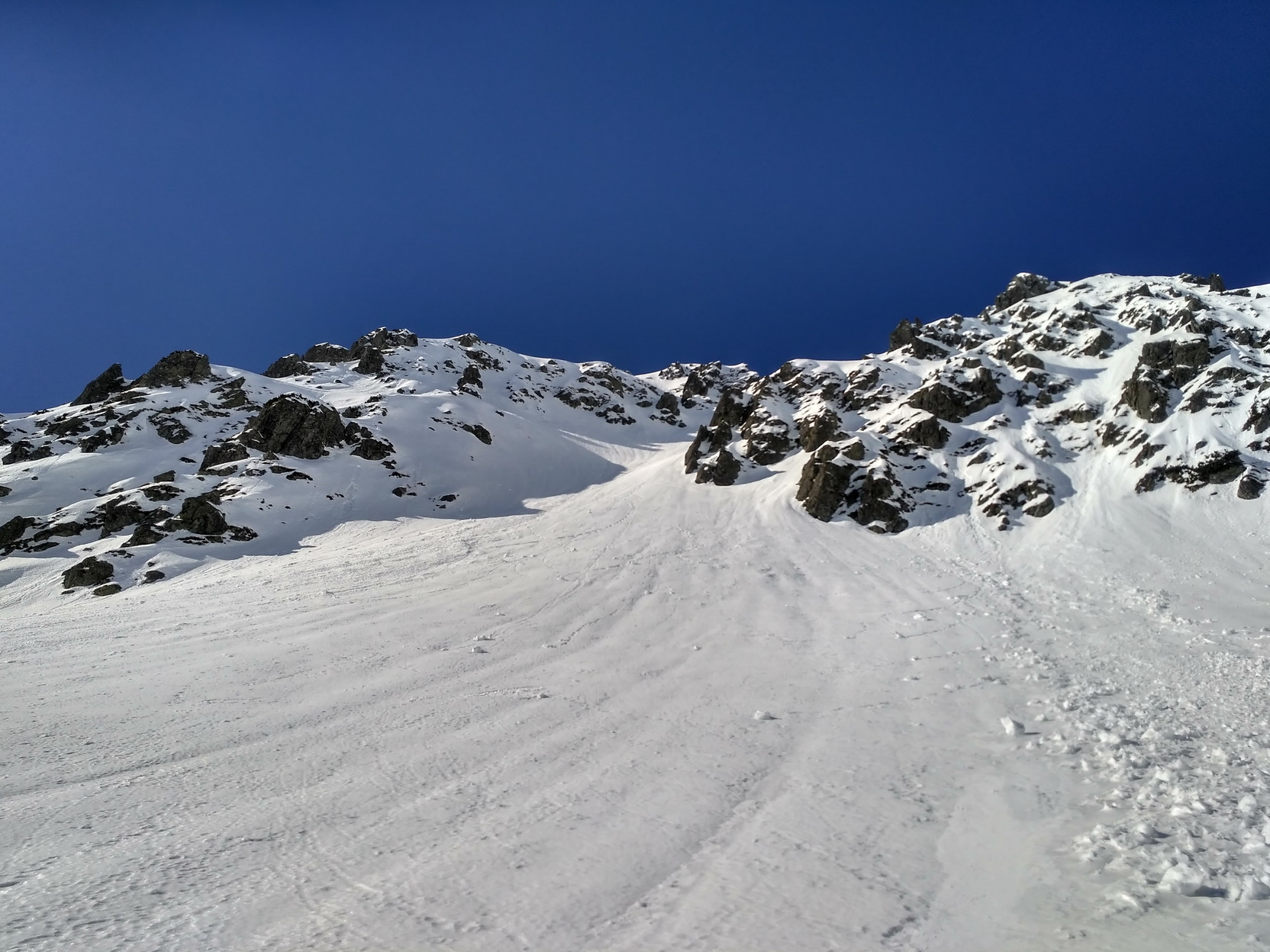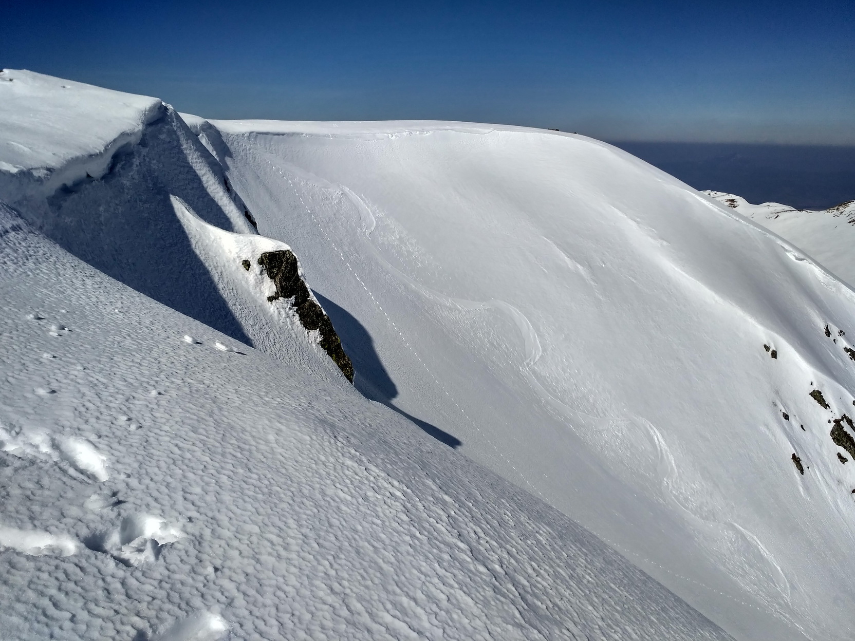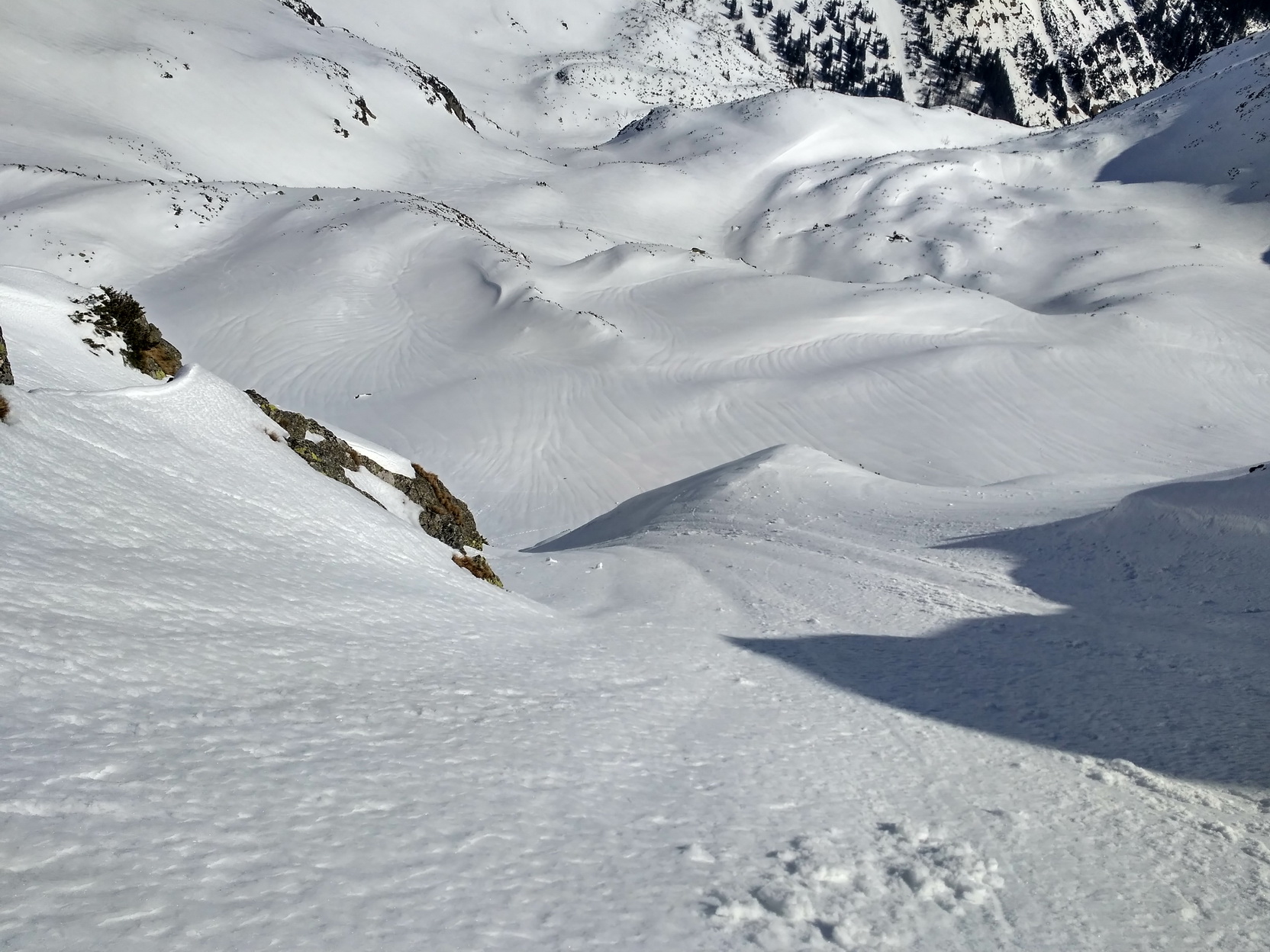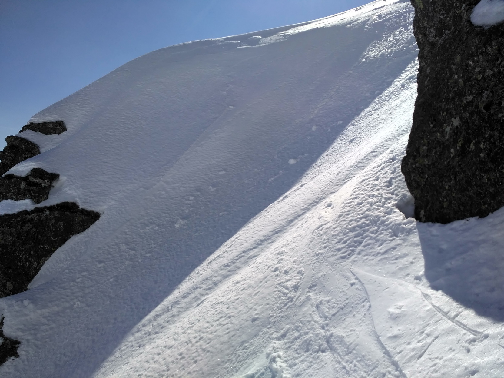 Lyže na batoh a ide sa hore obzrieť pripravenosť slečny odmietavej. Ľavá strana (z pohľadu výstupu) je krytá hrebienkom a slnko koncom marca dostáva len na krátky čas zrána. Aktuálne je už v tieni a zmäknúť nestihla. Aj sneh je tu, pre viac menej stály tieň, horší. Pravá strana je na tom lepšie. Ba až ideálne. Firník, ako sa na správny zážitok patrí. Takže rýchlo hore neprepásť správny moment. Po prekonaní hrany preveja iný svet - stolová hora, futbalové ihrisko – poste Skalka. Prestrojím a ide sa na to. Predtucha bola správna a konečne znižujem – 1:3 - hoci vzhľadom na kvalitu zážitku by to mohlo byť aj za dva. Nemal by som sa veľmi rozpisovať, aby to nevyznelo impertinentne. Takže len veľmi stručne: