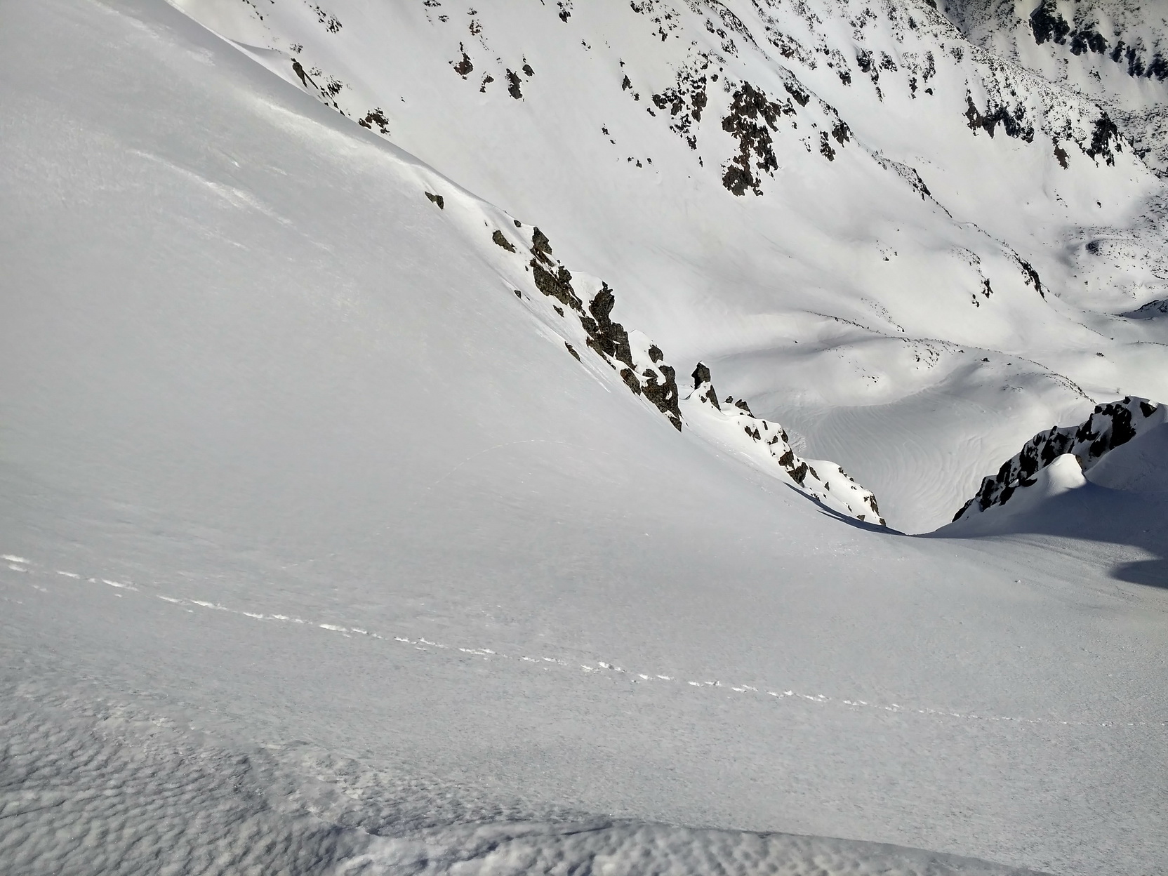 Z plochej vrcholovej pláne priamo cez stred okrajovej hrany do luxusnej mušle meniacej sa v žľiabok s jasným rozhraním ľadovo nedotknuteľného a vláčne pripraveného. Stále hlbšie a hlbšie, až k dolným priestrannejším partiám opatrne zľava obchádzajúc rizikové chladné miesto.
