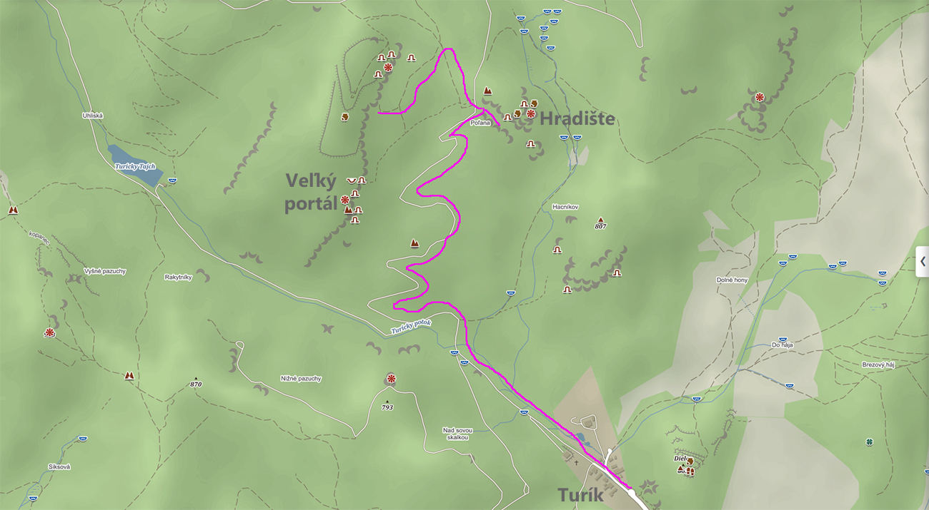 Veľký portál nad Turíkom poznajú asi najskôr skalolezci, lebo na tejto skalnej stene je naťahaných dosť zaistených ciest. Aj tu sa dá na hornom konci dediny zaparkovať na malej „otočke“ priamo pod Hradišťom (ale tam sa moc neoplatí vyliezť). Potom kus hore Turíckou dolinou a za veľkým drevoskladom doprava do serpentín širokej zvážnice. Po takom kiláku a pol ďalší sklad: od neho doprava je v lese ukrytý súbor brál, stien, priepastí a jaskyniek a vyhliadkových plošiniek, tiež pod názvom Hradište. Akosi je tých hradísk v okolí veľa, nie? K nášmu cieľu ale treba ísť doľava – po lesnej ceste mladinou. V lese na hornom konci rúbanísk už presvitá dlhá skalná stena, ktorá sa tiahne severo-južným smerom až dole, skoro na dno doliny. Na jej hornom konci ďalšie hradisko plus nejaké jaskynky, v dolnej tretine ten Portál, ktorý je fakt poriadny. Ešte nižšie je zaujímavá Karfiolová jaskynka a strmý chodník popod stenu až dole. Fotiek odtiaľ ale veľa nemám, tak aspoň mapka prístupu (https://sk.mapy.cz):