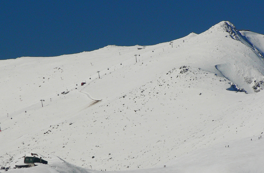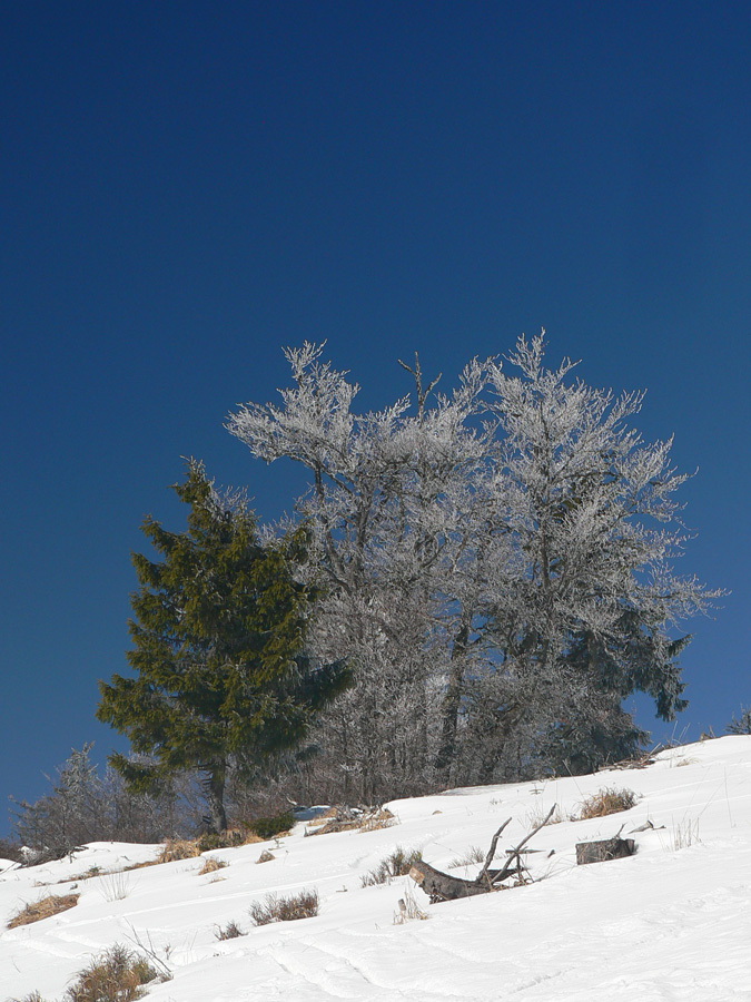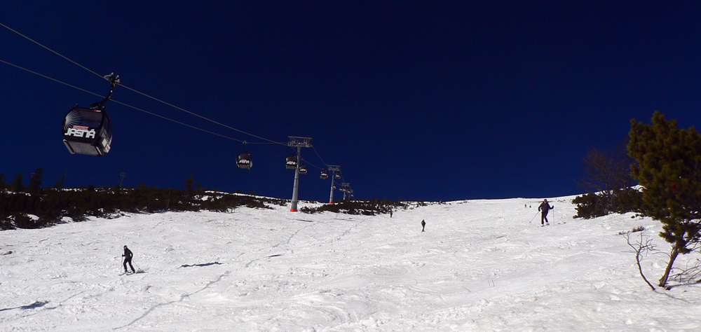 Masív Králičky je zato vysnežený súvislo, na všetky strany polyžovaný a lyžovateľný celkom dobre po drapľavom firne, smerom na sever dokonca stále po snehu. Stopa na temene je tvrdá, rýchla, Ďumbier podobne, aj keď viac rozlyžovaný a rozdupaný. Keďže rovnako tvrdo, aj keď našťastie nie ľadovo to vyzerá až po Chopok, skúsil som radšej trochu jarnej lyžovačky muldou z Demänovského sedla a z nej odjazd traverzom po modrej značke na Kosodrevinu. Okolo obeda celkom dobrá lyžovačka, ráno by to bolo poriadne hrkotanie po betónovom firne.