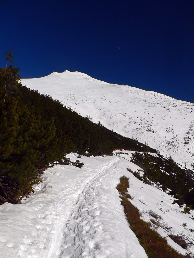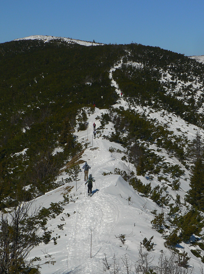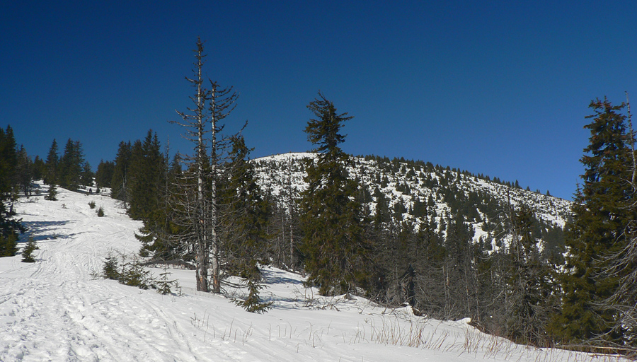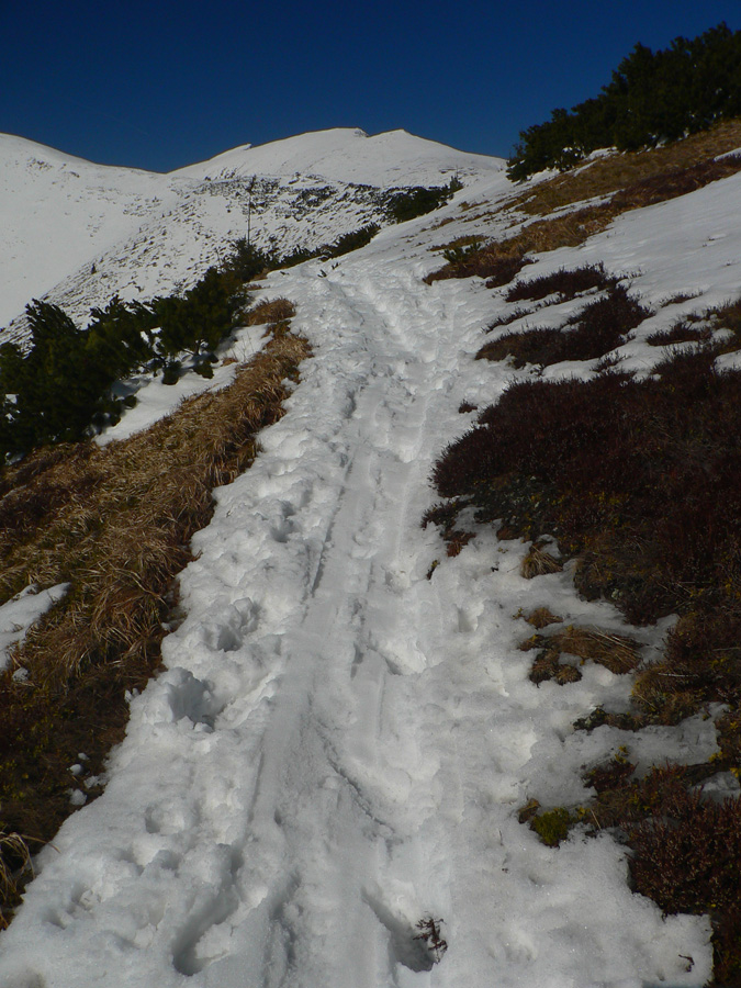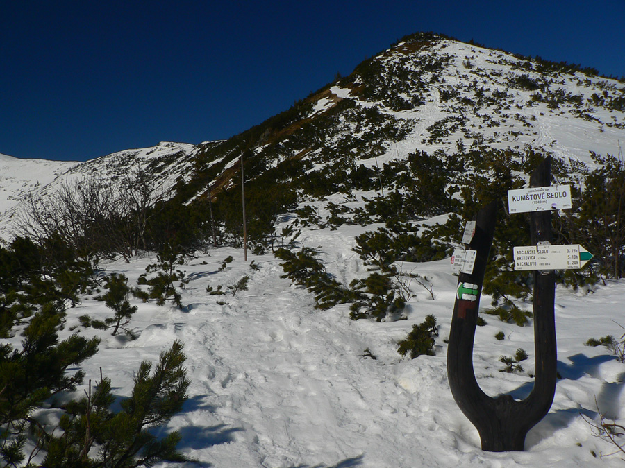 Medzi Lajštrochom a Kumštovým sedlom vedie kosodrevinovým tunelom udupaný až zľadovatený chodník, na niektorých miestach už začína byť trocha problém, kade prekľučkovať - tu sa to bude najrýchlejšie zhoršovať. Na jedinom mieste bol dole kopcom pomedzi kosovku trocha problém, lepšie bolo vyzuť lyže a pár metrov zbehnúť pešo. Ale nie kvôli nedostatku snehu, skôr kvôli úzkemu, kľukatému a strmému chodníku. Traverz južným svahom k smerovníku v Kumštovom sedle sa ešte dá, ale dlho to trvať nebude, už je to len tak - tak. Lepšie vyzerá zimná trasa vrchom popri tyčiach, aj keď aj tam už je nutné zájsť troška viac na sever a pokľučkovať pomedzi kosovku.
