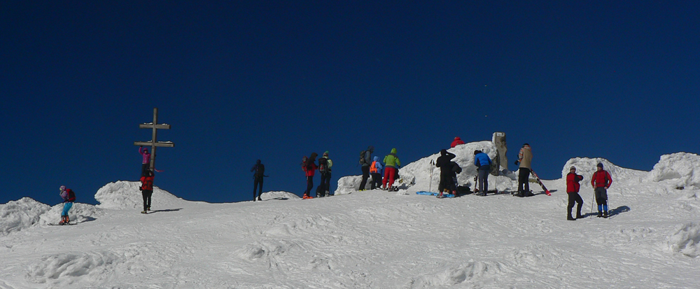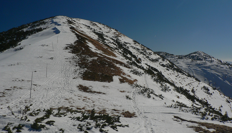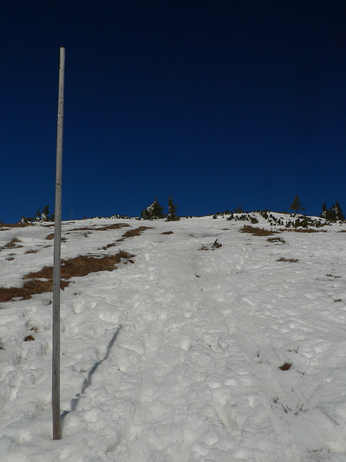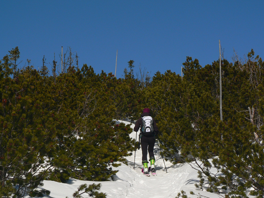 Stúpanie zo zjazdovky na Lajštroch už poriadne cíti nedostatok snehu tejto zimy, trčí tam spod snehu už všeličo a o pár dní už bude treba dosť obchádzať a prenášať. Pod nohami väčšinou už firn, ráno samozrejme zamrznutý a keďže rozjazdený, aj dosť hrboľatý. Pešiaci si tu cez deň užijú, lebo sa budú prebárať poriadne hlboko.