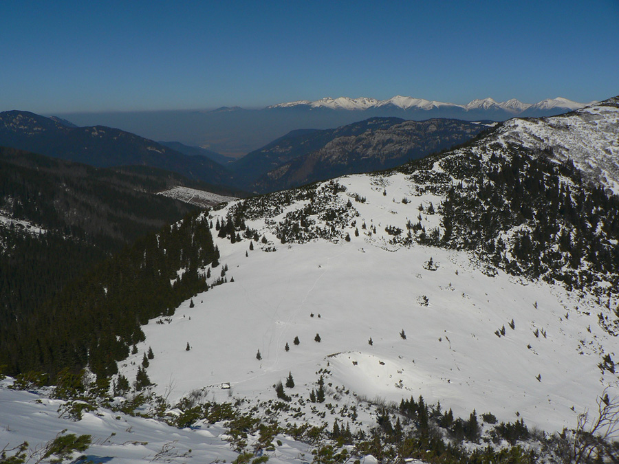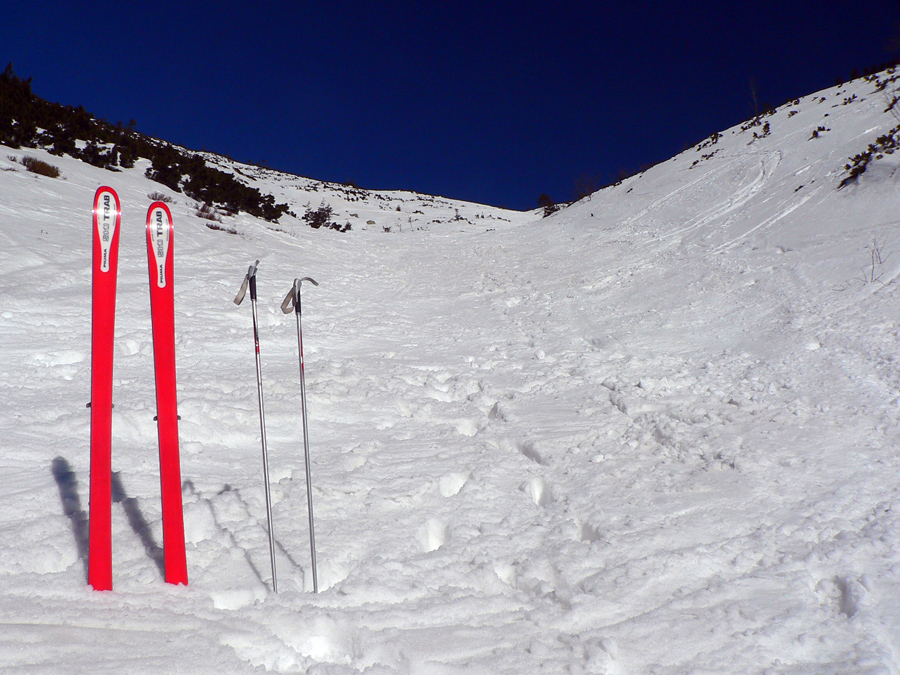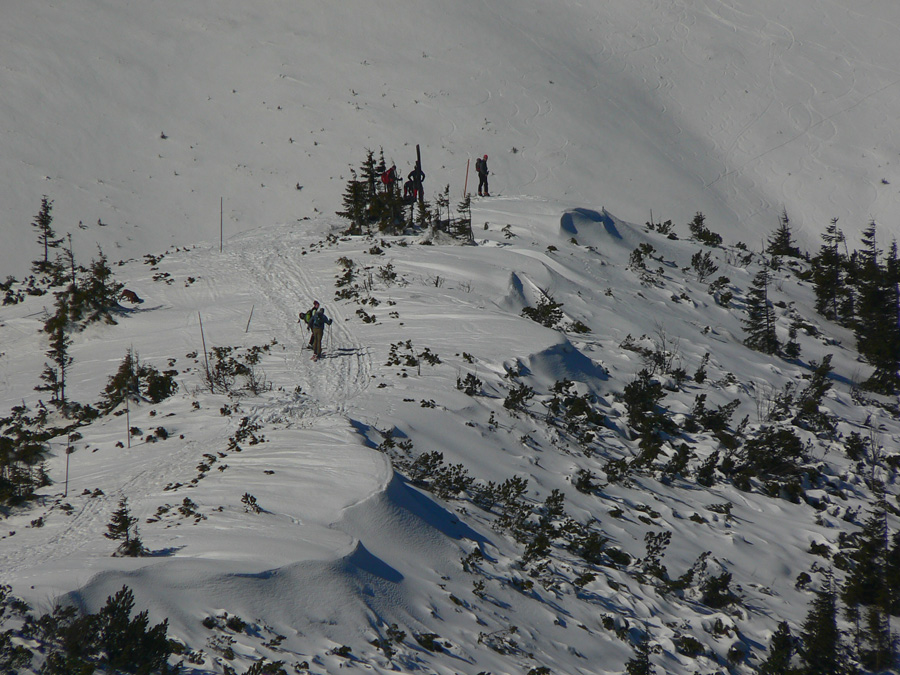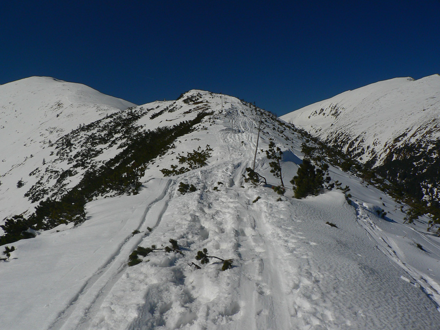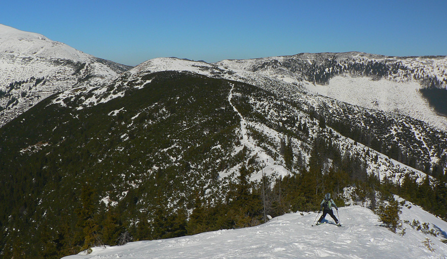 Navnadený Rolandovými fotkami zo začiatku marca, vybral som sa preskúmať reálne podmienky na jednej z najobľúbenejších a v súčasnej biede zároveň na jednej z mála možných skialpových hrebeňových trás. Pred blížiacim sa víkendom pridávame preto zopár (dúfam že ešte) aktuálnych fotiek z obľúbenej trasy - z druhej marcovej nedele. Hneď na začiatok ale treba zdôrazniť, že kto to chce prejsť na pásoch, mal by sa poponáhľať, lebo hneď po tom poslednom snežení (na prelome februára a marca) sa na dlhšie vyjasnilo a slnko už bije najmä do južných svahov naplno. Aspoň že noci sú stále mrazivé a sneh sa netopí hneď od rána. Nedeľa po MDŽ bola skoro ideálna, aj keď severovýchodný vietor bol miestami (najmä v sedlách a vo vyšších polohách hrebeňa) dosť jedovatý. Zato ale zabezpečoval, že sneh nebol úplne na kašu, v nižších častiach to skašovatelo až pred poludním, vyššie bol sneh tvrdý a stopa často ľadovo šmykľavá celý deň. Tesne po poludní už som už aj na južných svahoch pod hrebeňom lyžoval na "hrachu a kryštálovom cukre" :-)