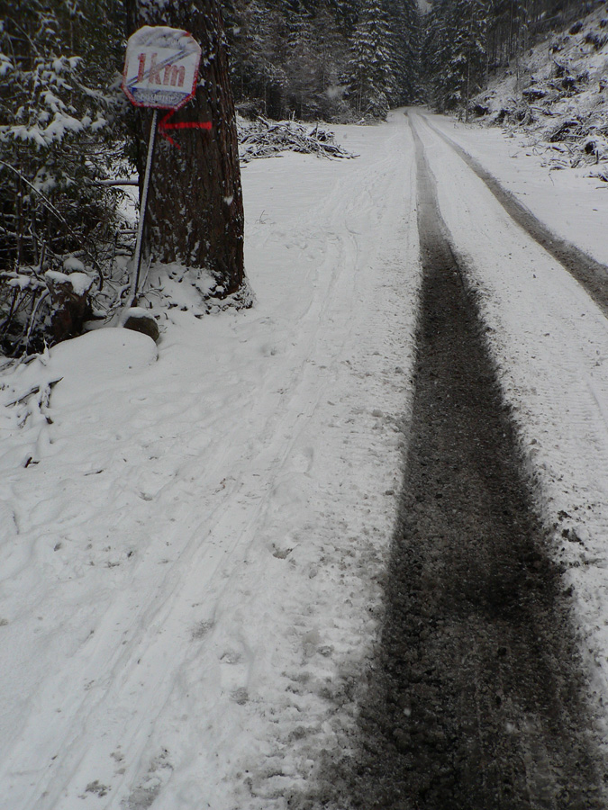 Definitívne som zahamoval (bez ujmy) tam, kde som sa ráno obúval, len predtým bolo už nutné obchádzať zo dva asfaltové fľaky a pár miest, kde štrku bolo viac ako snehu. Napríklad hneď mostík pod chatou. A je nedeľa ráno, celú noc pršalo a pokračuje, takže je po aktuále, ide jar, už asi tretí raz túto zimu :-(