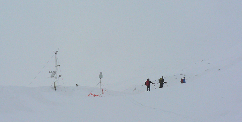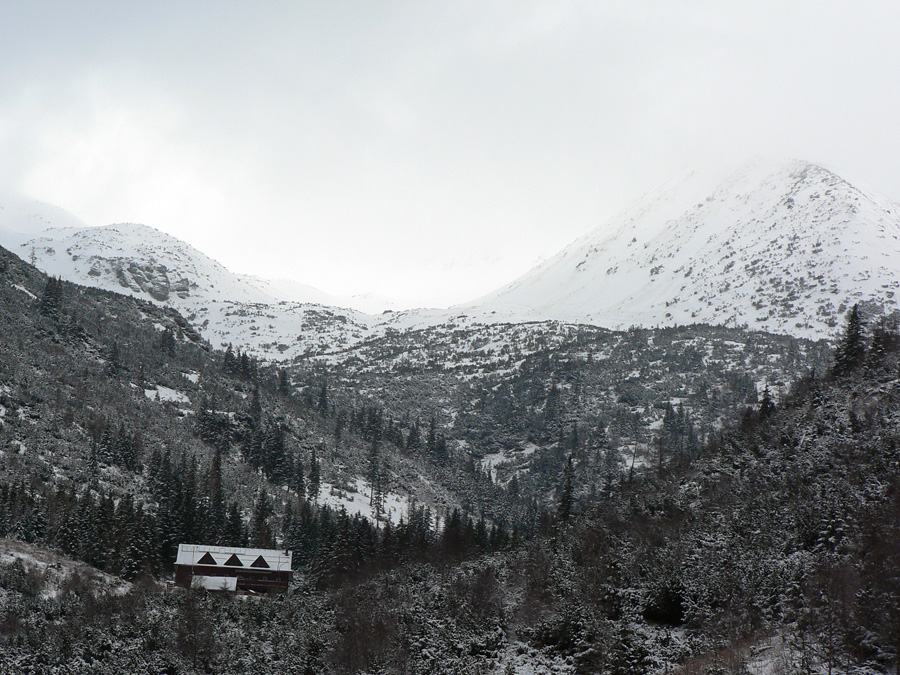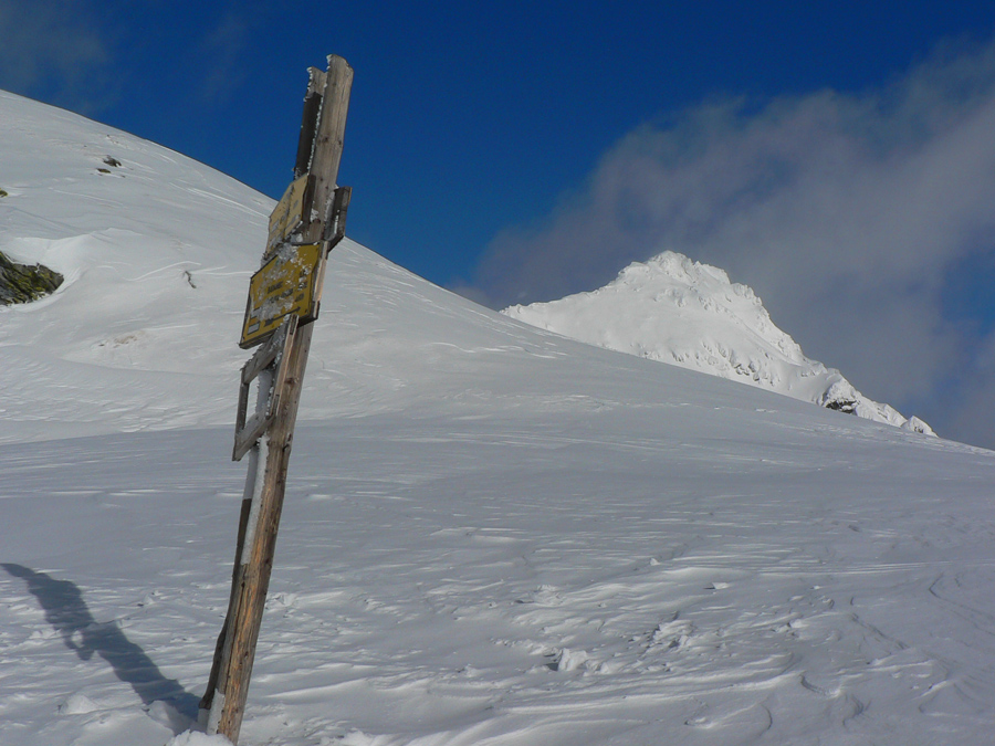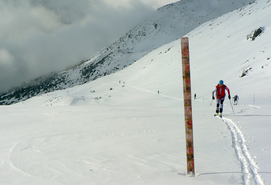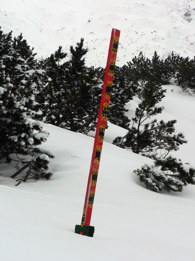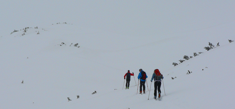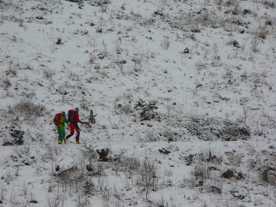 Tak nazad pod Terasu – chodník síce ľadový (nový sneh už bol odhrnutý predjazdcami), ale na túto biedu komfortne široký aj na zjazd. Pod Smutným sedlom už sadlo poriadne mlieko, ale hore bolo dosť ľudí, aj v širokom žľabe medzi Hrubou a Troma Kopami boli už ráno dvaja a poobede tam smerovali ďalší. Tak som si povedal, že skúsim Hrubú cez Lúčne sedlo. Čiže namiesto Závratov tu mala byť pôvodne Hrubá Kopa, ale som ju ani Lúčne sedlo jednoducho netrafil v tom mlieku :-) Ani to nemalo veľmi zmysel sa tam štverať: pod skalami v traverzoch aj vyše pol metra nafúkaného snehu, na kopčekoch pod meteostanicou striedanie ľadových platní a rôzne hlbokých pascí ufúkaného snehu, do toho viditeľnosť 0, no proste smerom dole horšie ako hore. Tak som sa len pomotal v kotli pod Baníkovom a pod Kopami a odišiel štrikovať pomedzi kosku dole k chate.