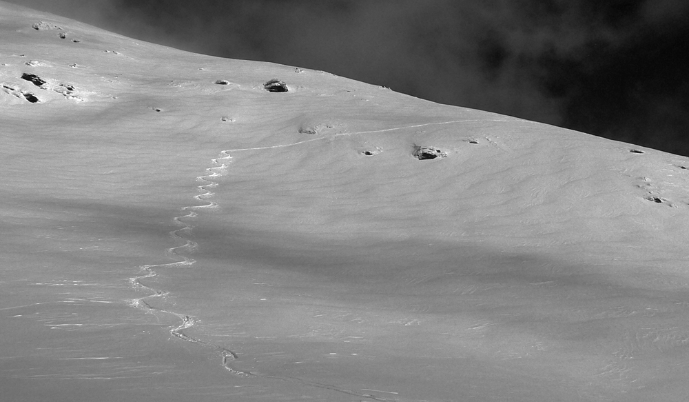 Prvý cieľ: Žiarske sedlo. Zamrznutá stará stopa zaviata práškom, miestami do 20cm nového snehu na ľade, čím vyššie, tým viac ľadových platní. Ale väčšinou nový sneh, ubitý vetrom. Aj na Plačlivô tak. Dole prvých asi 10 oblúčikov prachovačka, potom trochu trápenie v hutnom snehu. Hlásená bola lavínová trojka, najmä v južných svahoch, tak som radšej oblúkoval povedľa výstupovej stopy a len nižšie natraverzoval do svahu vyskúšať čerstvý sneh. Ale príliš hustý bol na moje garnižky bez rokera :-)