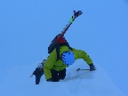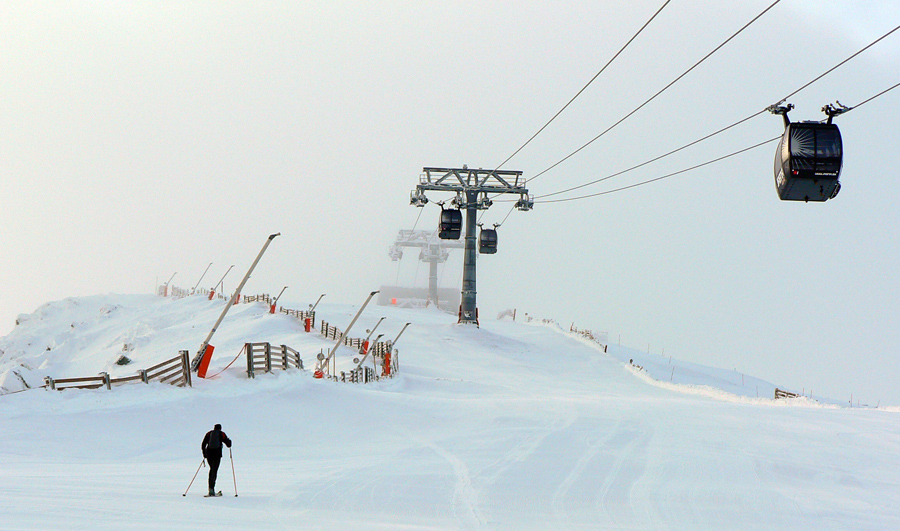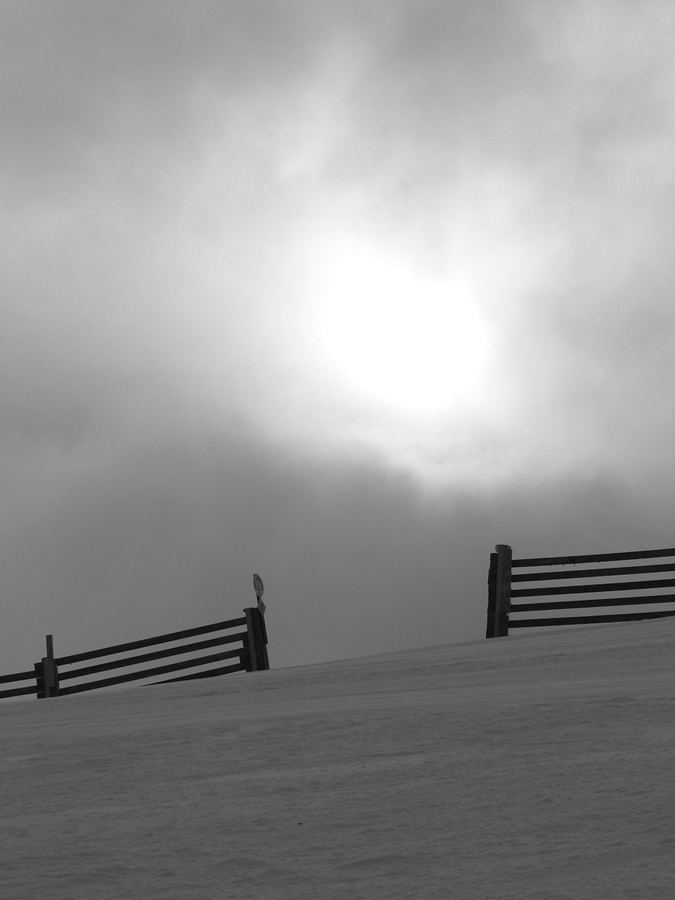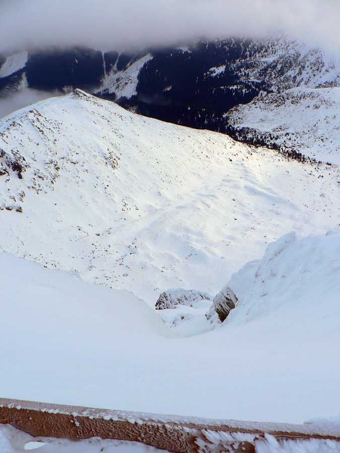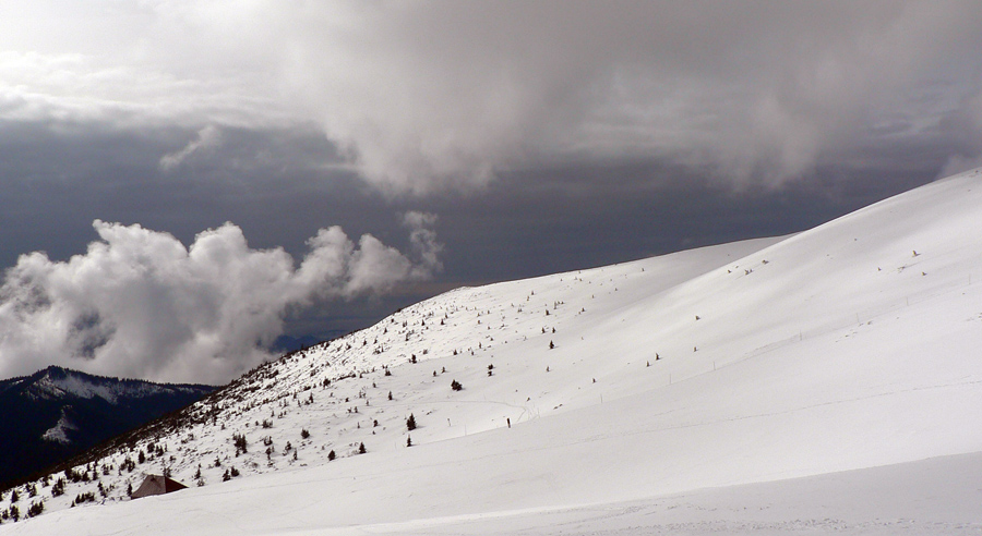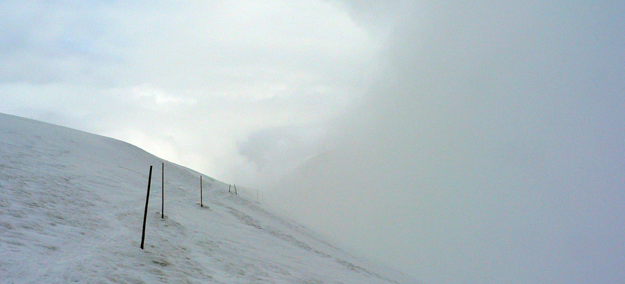 Doma boli len domáci, ktorí ráno vyprevadili nejakých 11 snežničiarov a 2 pásovcov - tých som postretal cestou. Tak som trochu pootravoval, dozvedel som sa, že najviac tu dokázalo prespať 96 (!!!) ľudí, poďakoval za fajný bylinkový čajík a pobral sa nazad. Mraky sa akosi začali zbiehať, za Chabencom sa všetko skrylo do hmly a dokonca začalo čoraz výdatnejšie snežiť. Tá predpoveď akosi nevychádzala... Neostávalo nič, len skloniť hlavu, zapichnúť oči do stopy pred lyže a posunovať sa od tyče k tyči. Ešte som dal pokus o východný kotol Kotlísk, či dole nebude hmly menej, ale tá kôrka a nižšie mokrý firn a do toho to difúzne svetlo... Nič moc lyžovačka, výhľady pod nohy už vôbec.