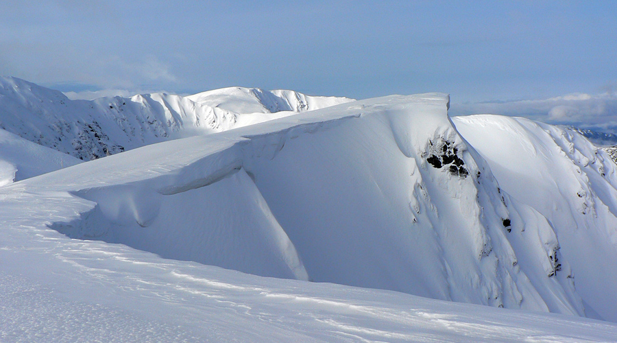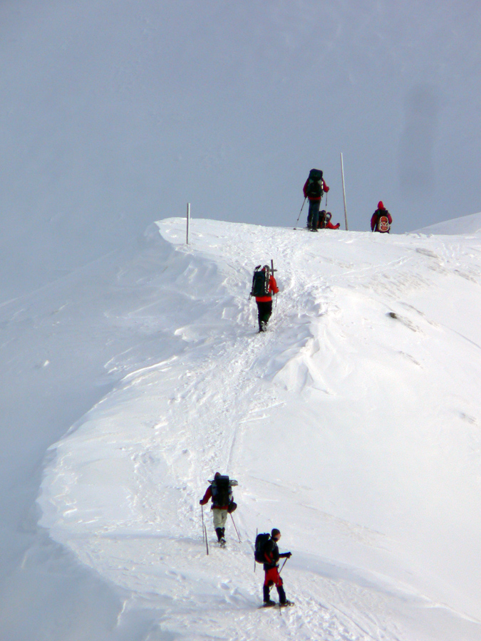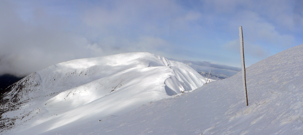 Na sobotu hlásili mínusové teploty až od nejakých 1200m a ráno ešte malo miestami pršať, aj keď počas dňa sa malo čiastočne vyjasňovať. Takže taktika bola jasná: Jasná :-) Teda rýchlo čo najvyššie a tam ostať čo najdlhšie. A ráno čím skôr na hrebeň, nech pásy zbytočne nevlhnú. Milým prekvapením o siedmej ráno na Otupnom bola zamrznutá pista, čo som vôbec nečakal, len mraky viseli nejako "prekliato nízko". Už nad Lukovou. Ale cestou na Chopok bolo vidieť, že aj oblaky stúpajú, až nakoniec od hrebeňa skoro celkom zmizli. Našťastie zakryli slnko, lebo to keď sa oprelo pred poludním do južných svahov, hneď bol sneh mokrý.