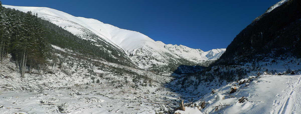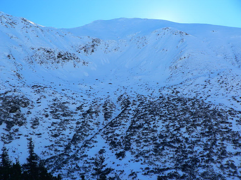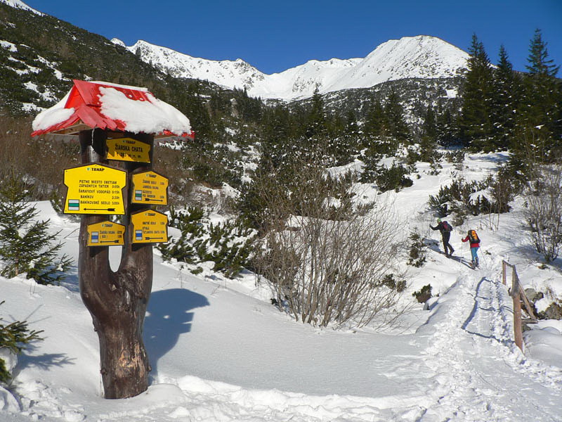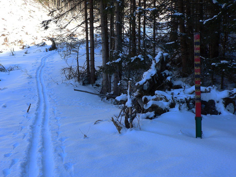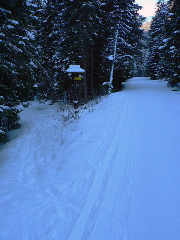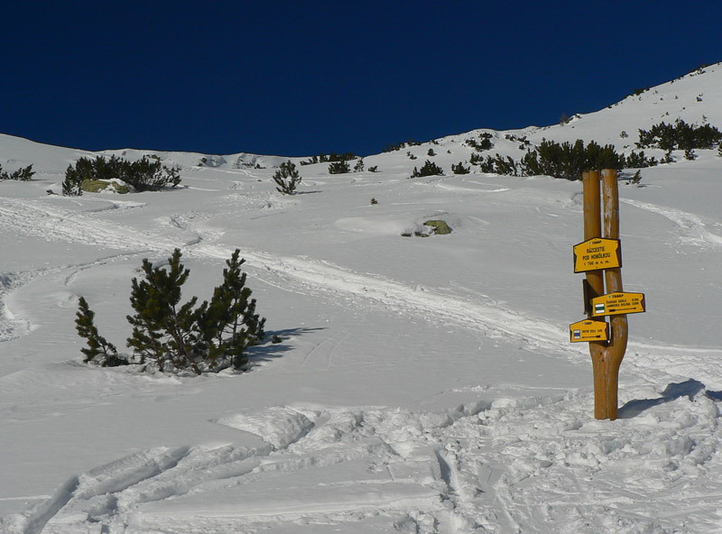 Sneženie nejako Tatry zas obišlo, ale ten milimeter aspoň prikryl ľad na ceste, takže tá je už od parkoviska šliapateľná komfortne, len paličku niekedy niet do čoho zapichnúť. Aj z konečnej autobusu by sa dalo, keby nie posyp. Nad chatou je to až po Rázcestie pod Homôľkou prepletanie kosodrevinou, ale pohodové, horšie je to tadiaľto smerom dolu, ešte tak meter snehu treba. A je to už miestami vydraté, pár nadávok na čerstvo odkryté skaly sa nieslo dolinou...
