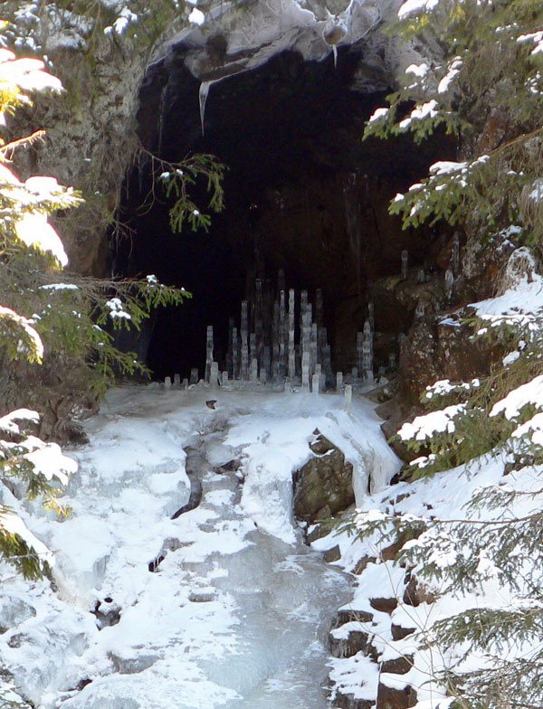Po ceste dolu som ešte odskočil pozrieť zamrznutý Šarafiový vodopád, ale snehu málo, nazad k chate som sa spustil radšej na pásoch. Cesta dolu v pohode, uchodená, nič netrčalo spod snehu. Kúsok nad parkoviskom sa ešte oplatí zblízka obzrieť jaskynku so zaujímavými „stalagmitmi“.
