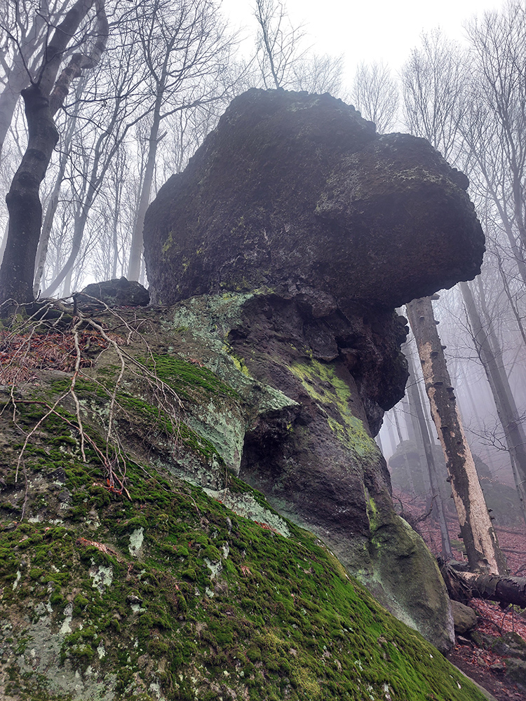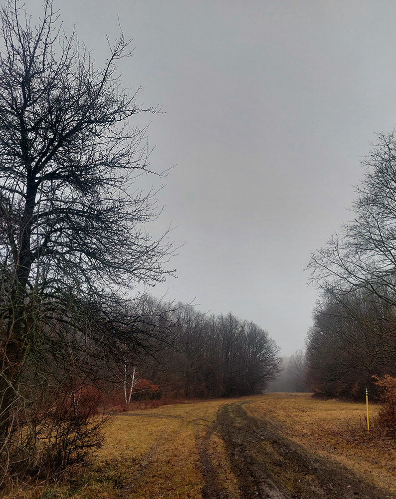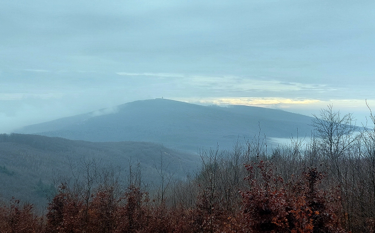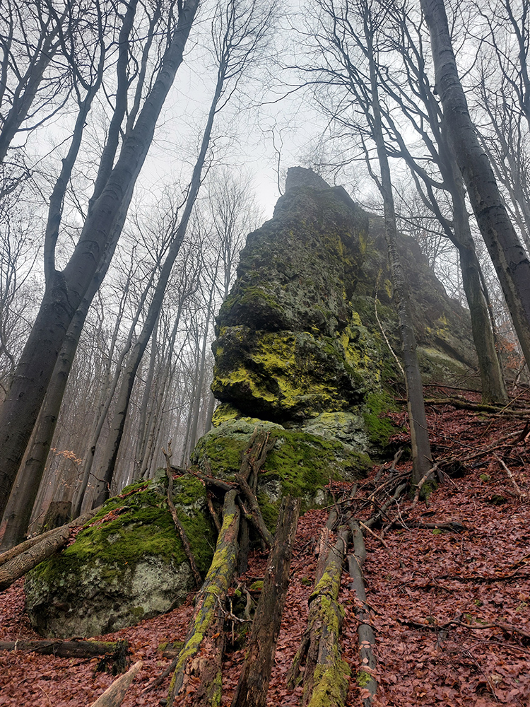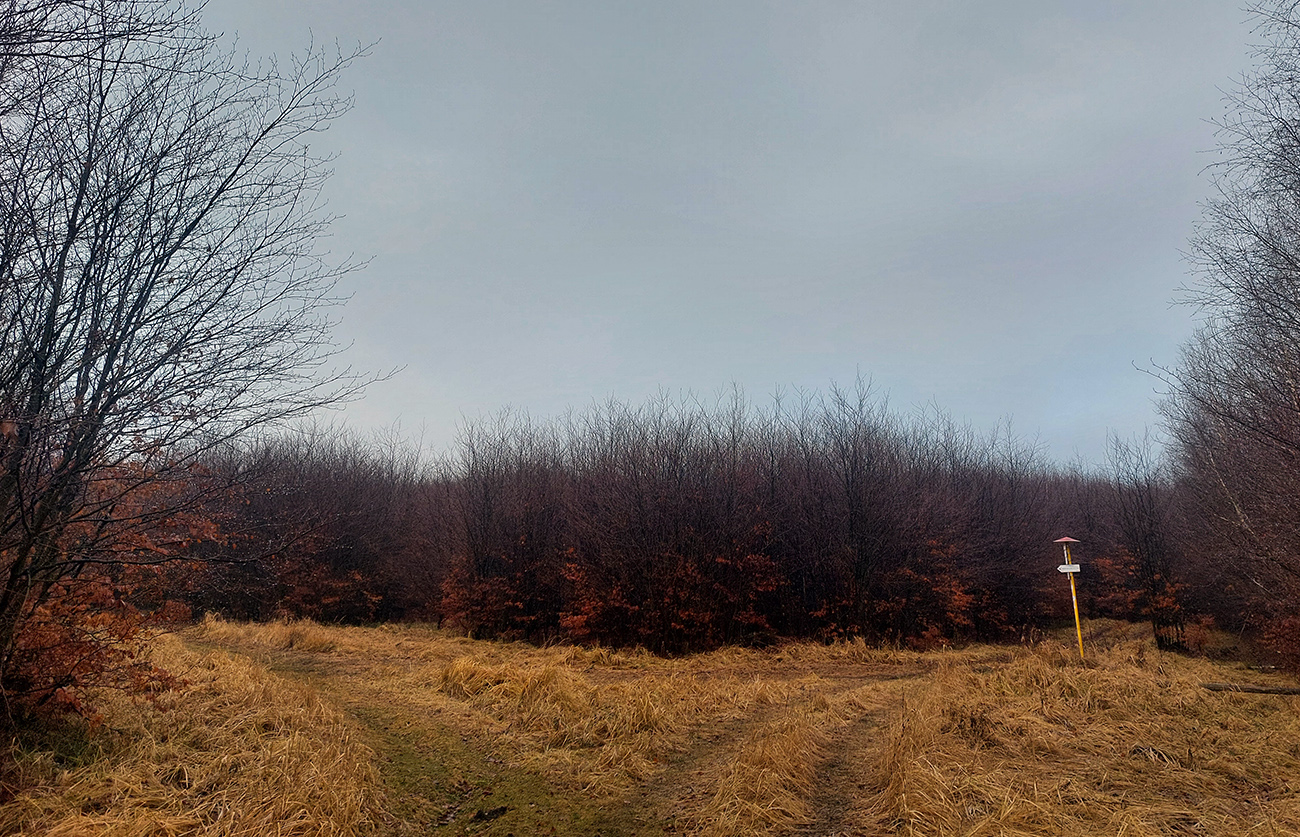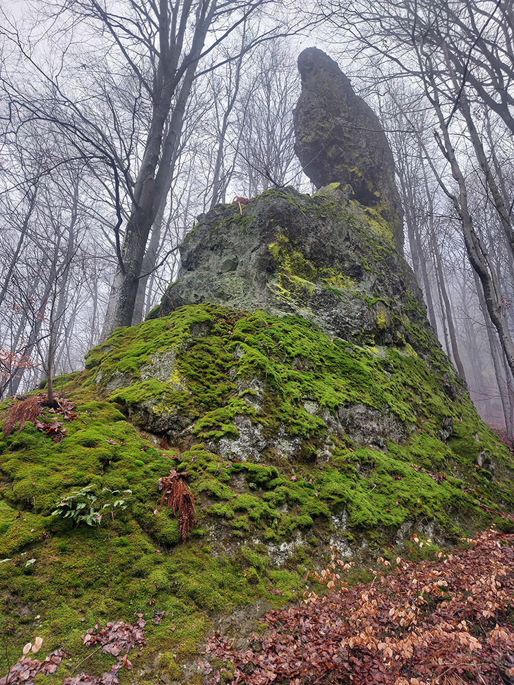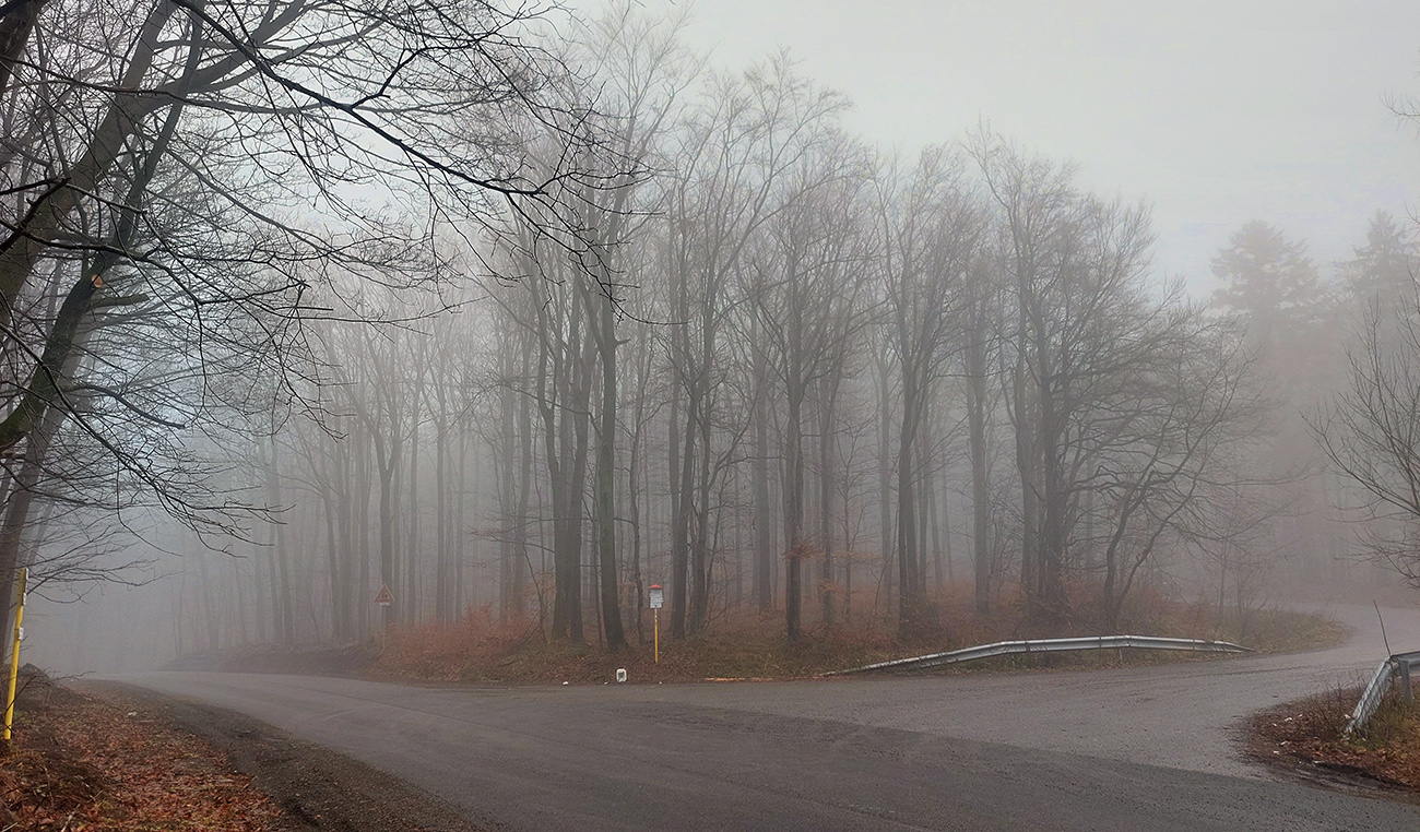 Horskú hradbu, oddeľujúcu Košickú kotlinu a Východoslovenskú nížinu, tvorí od severu na juh päť podcelkov, v podstate bývalých treťohorných sopiek (Šimonka, Makovica, Mošník, Bogota a Milič). Po Miliči som sa už raz motal ( TU ), asfaltové cesty cez Bogotu ma moc na pešiu turistiku nelákajú, tak prišiel rad na dve „sopky“ z názvu. A rovno poviem, že nič moc, ale GPX je hore, ak niekto chce. Je tam síce pár pekných miest, ale medzi nimi hafo fádnych lesných ciest, vylepšených koncom upršaného decembra 2025 (keď som sa tam motal) blatom po ťažobných strojoch. Do toho šedivé počasie s hmlou a občasným mrholením – to estetike moc neprospelo. Ale dobré to bolo na pobehanie a vyvenčenie tela. A aby som si potom vážil tie pekné dni :-) Takže som vyrazil od herlianskeho umelého gejzíru na vyhliadkové Rankovské skaly, vybehol na Makovicu, z nej zbehol na druhú stranu „hrebeňa“ popri „Skalách pod Pariakovou“ a potom už som len cez Herlianske sedlo a vrchol Mošníka dupal do Dargovského sedla, lebo odtiaľ ide každú chvíľu autobus: