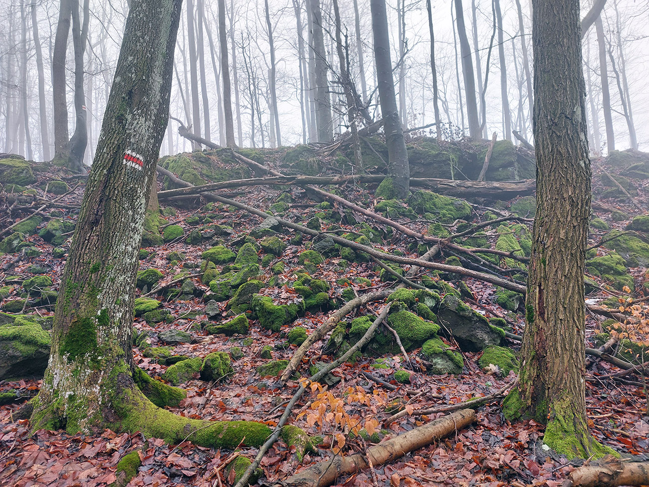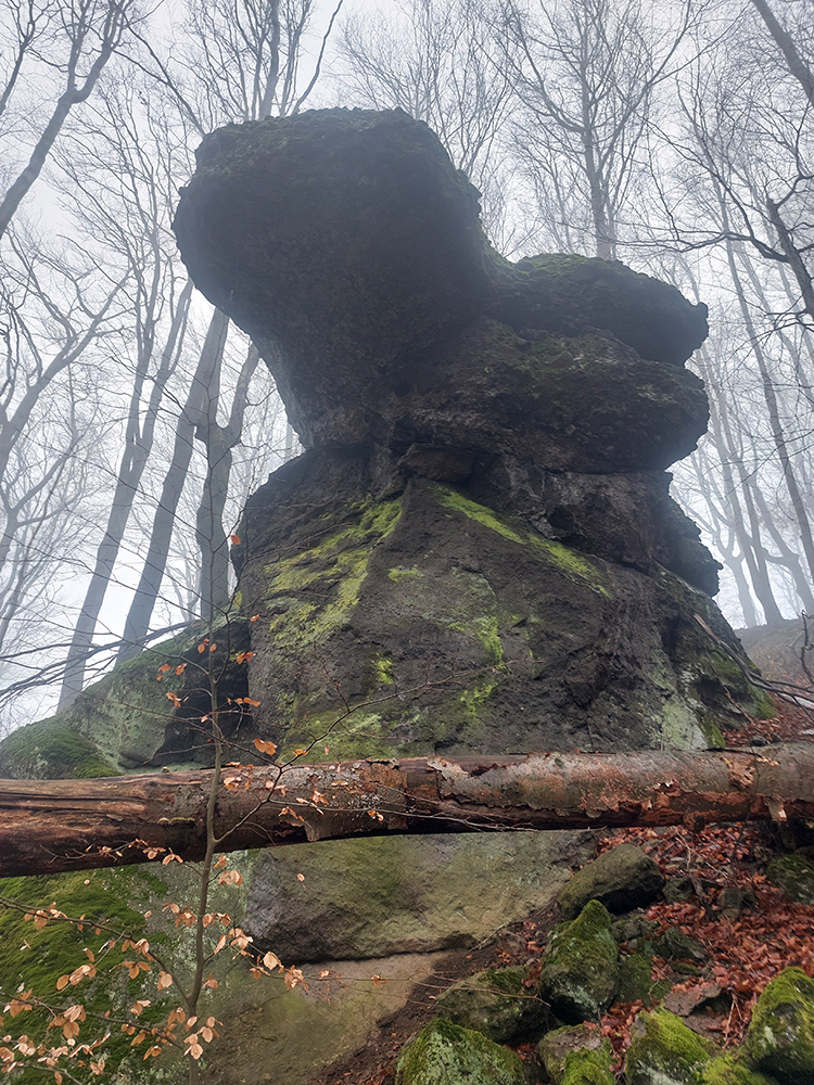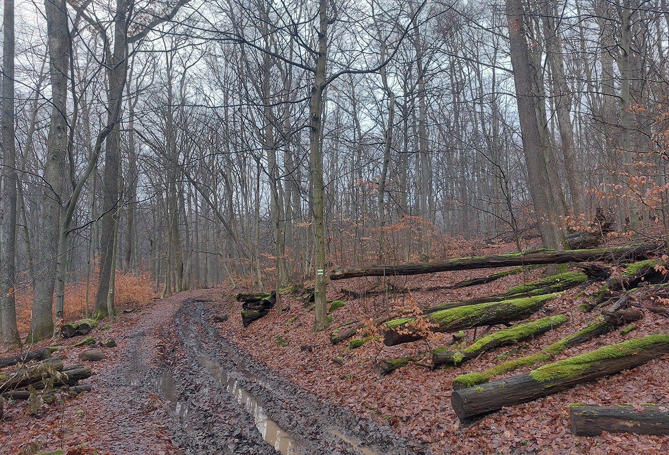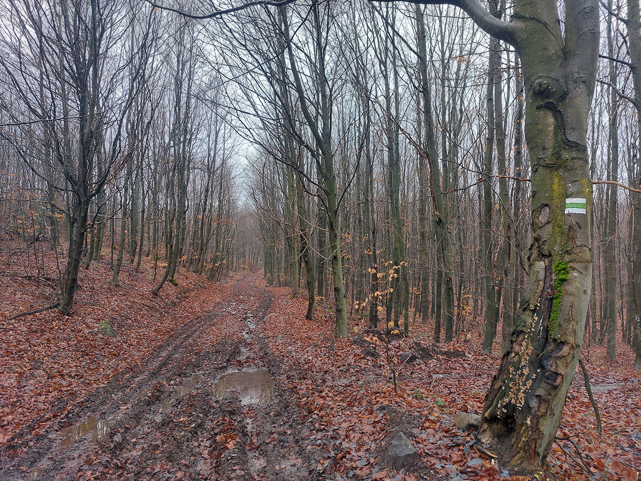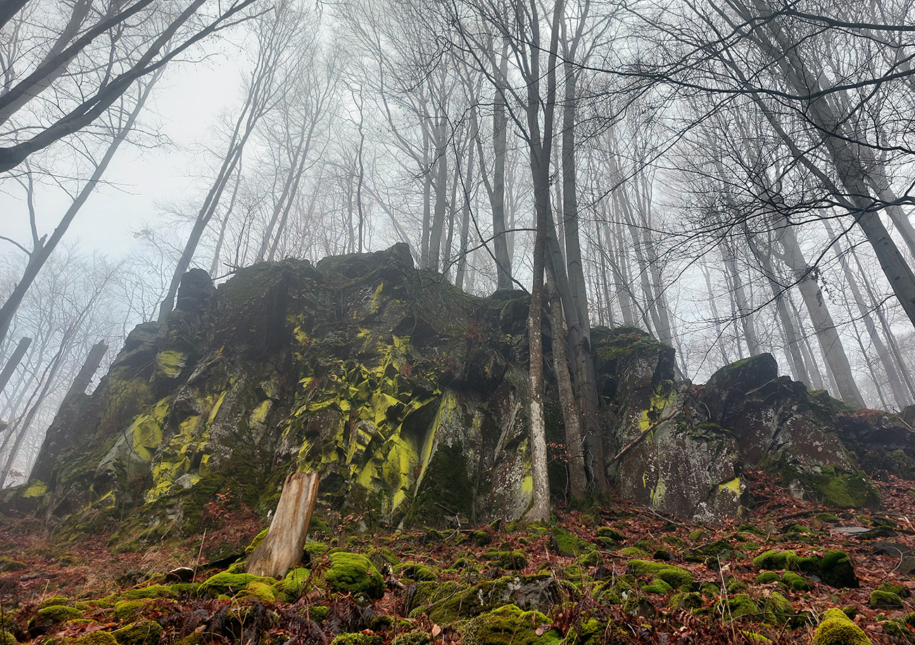 Horskú hradbu, oddeľujúcu Košickú kotlinu a Východoslovenskú nížinu, tvorí od severu na juh päť podcelkov, v podstate bývalých treťohorných sopiek (Šimonka, Makovica, Mošník, Bogota a Milič). Po Miliči som sa už raz motal ( TU ), asfaltové cesty cez Bogotu ma moc na pešiu turistiku nelákajú, tak prišiel rad na dve „sopky“ z názvu. A rovno poviem, že nič moc, ale GPX je hore, ak niekto chce. Je tam síce pár pekných miest, ale medzi nimi hafo fádnych lesných ciest, vylepšených koncom upršaného decembra 2025 (keď som sa tam motal) blatom po ťažobných strojoch. Do toho šedivé počasie s hmlou a občasným mrholením – to estetike moc neprospelo. Ale dobré to bolo na pobehanie a vyvenčenie tela. A aby som si potom vážil tie pekné dni :-) Takže som vyrazil od herlianskeho umelého gejzíru na vyhliadkové Rankovské skaly, vybehol na Makovicu, z nej zbehol na druhú stranu „hrebeňa“ popri „Skalách pod Pariakovou“ a potom už som len cez Herlianske sedlo a vrchol Mošníka dupal do Dargovského sedla, lebo odtiaľ ide každú chvíľu autobus: