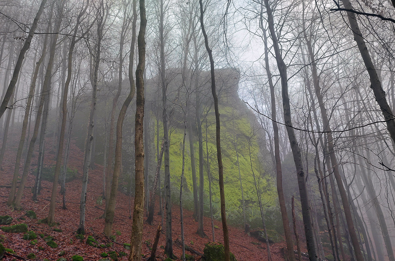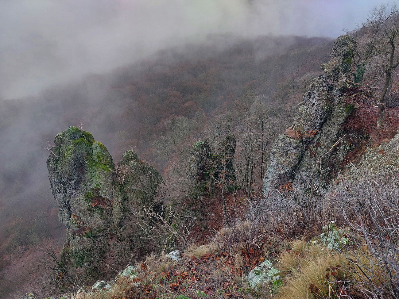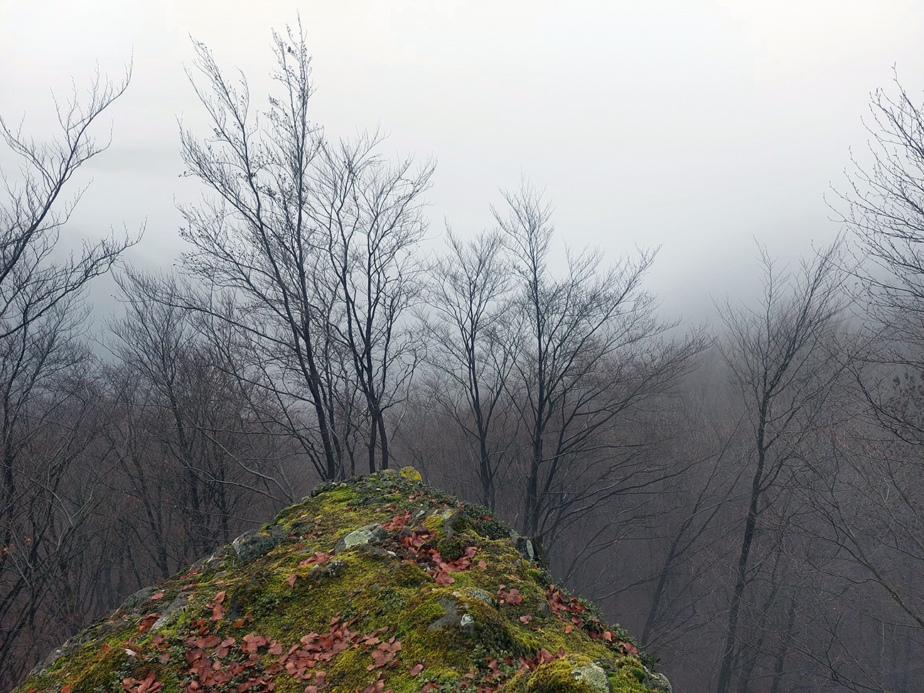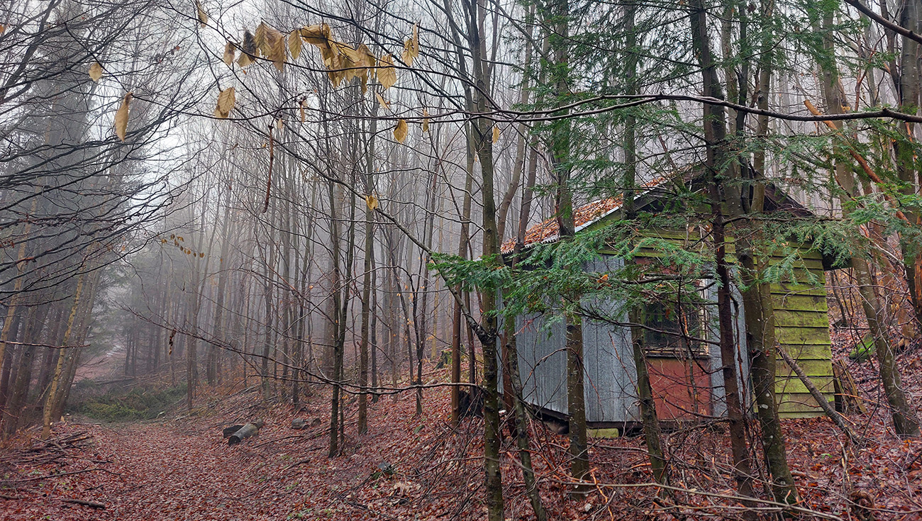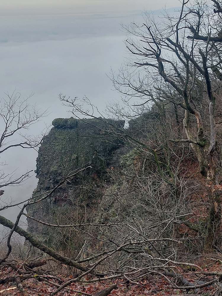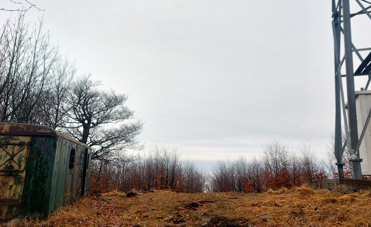 Horskú hradbu, oddeľujúcu Košickú kotlinu a Východoslovenskú nížinu, tvorí od severu na juh päť podcelkov, v podstate bývalých treťohorných sopiek (Šimonka, Makovica, Mošník, Bogota a Milič). Po Miliči som sa už raz motal ( TU ), asfaltové cesty cez Bogotu ma moc na pešiu turistiku nelákajú, tak prišiel rad na dve „sopky“ z názvu. A rovno poviem, že nič moc, ale GPX je hore, ak niekto chce. Je tam síce pár pekných miest, ale medzi nimi hafo fádnych lesných ciest, vylepšených koncom upršaného decembra 2025 (keď som sa tam motal) blatom po ťažobných strojoch. Do toho šedivé počasie s hmlou a občasným mrholením – to estetike moc neprospelo. Ale dobré to bolo na pobehanie a vyvenčenie tela. A aby som si potom vážil tie pekné dni :-) Takže som vyrazil od herlianskeho umelého gejzíru na vyhliadkové Rankovské skaly, vybehol na Makovicu, z nej zbehol na druhú stranu „hrebeňa“ popri „Skalách pod Pariakovou“ a potom už som len cez Herlianske sedlo a vrchol Mošníka dupal do Dargovského sedla, lebo odtiaľ ide každú chvíľu autobus: