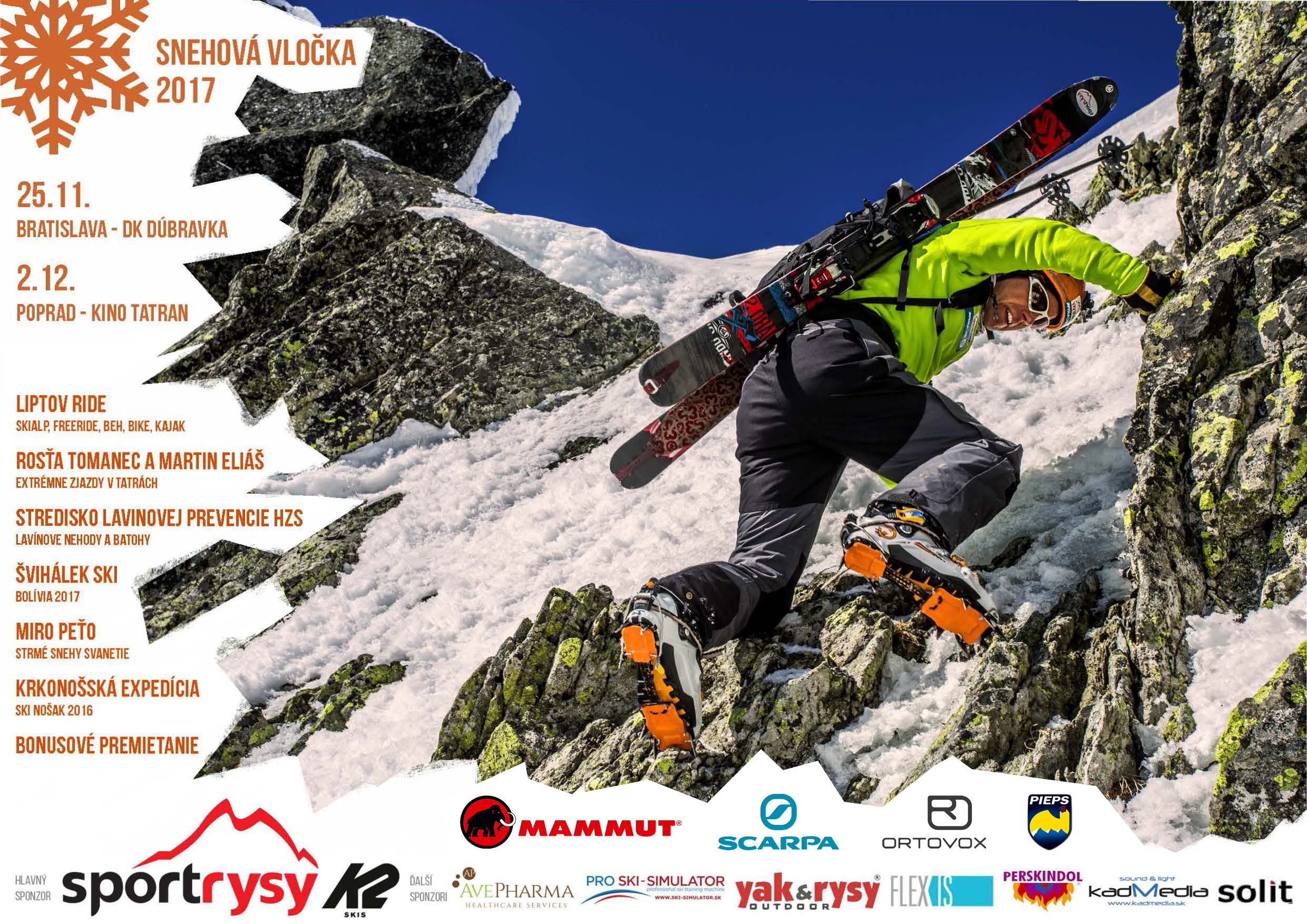 Či už ste skialp sezónu 2017/2018 zahájili alebo nie, skialpový filmový festival Snehová vločka je tu pre všetkých, čo majú radi pohyb na lyžiach mimo zjazdoviek. Stretneme sa už túto sobotu 25. 11. 2017 od 16,00 v DK Dúbravka v Bratislave a pre veľký úspech aj v sobotu 2. 12. 2017 v Poprade v kine Tatran, rovnako od 16,00.