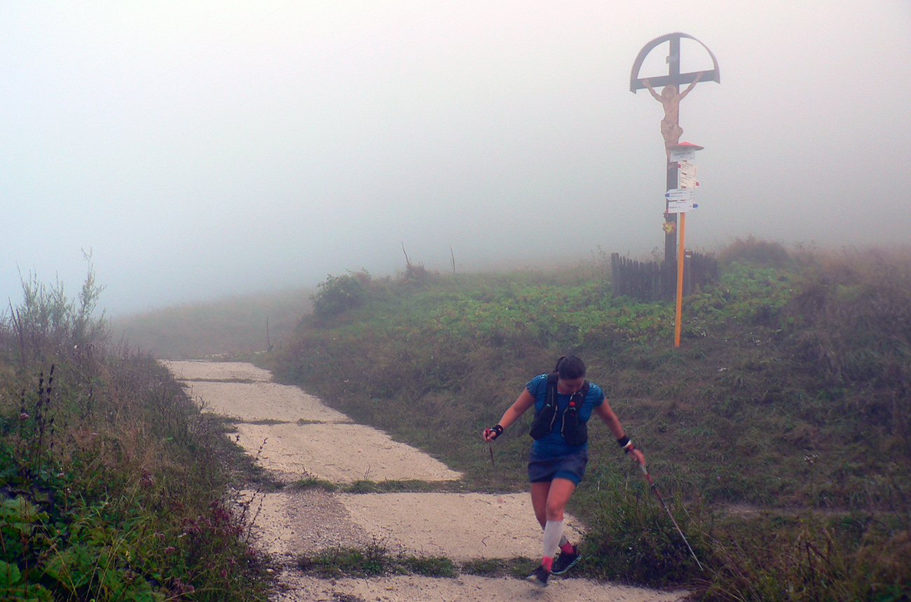 Tak sme teda začali, za totálnej tmy, a už som sa len triasol, aby som nás nezviedol do zlého smeru, lebo by mi bola ešte väčšia hanba. Podarilo by sa mi to dvakrát hneď v Ľubochni, ale Julkine múdre hodinky boli proti. Potom, v prudkom výstupe Korbeľkou na Kopu už som si radšej držal pár metrov náskok, aby som v tom bordeli hľadal smer. Lebo zaváľané je to tam teda poriadne, už zase. Ku prečistenej staršej kalamite pribudli po letných víchroch ďalšie preliezky, a že ich je... Skoro dve hodiny sme sa trápili, kým sme prišli ku krížu. Poriadna morda na úvod! Ale ten výhľad na prebúdzajúcu sa Oravu, ešte prikrytú sivou inverznou perinou, stál za to: