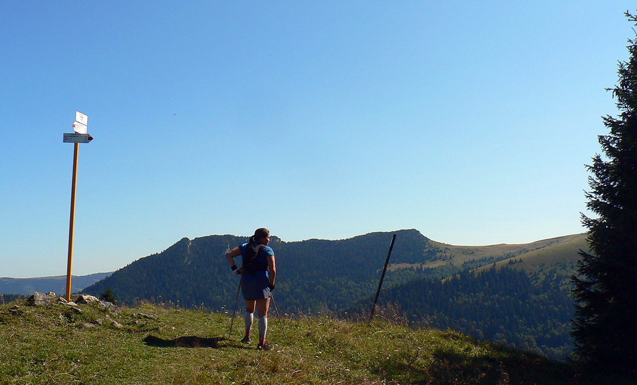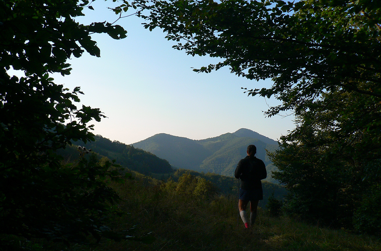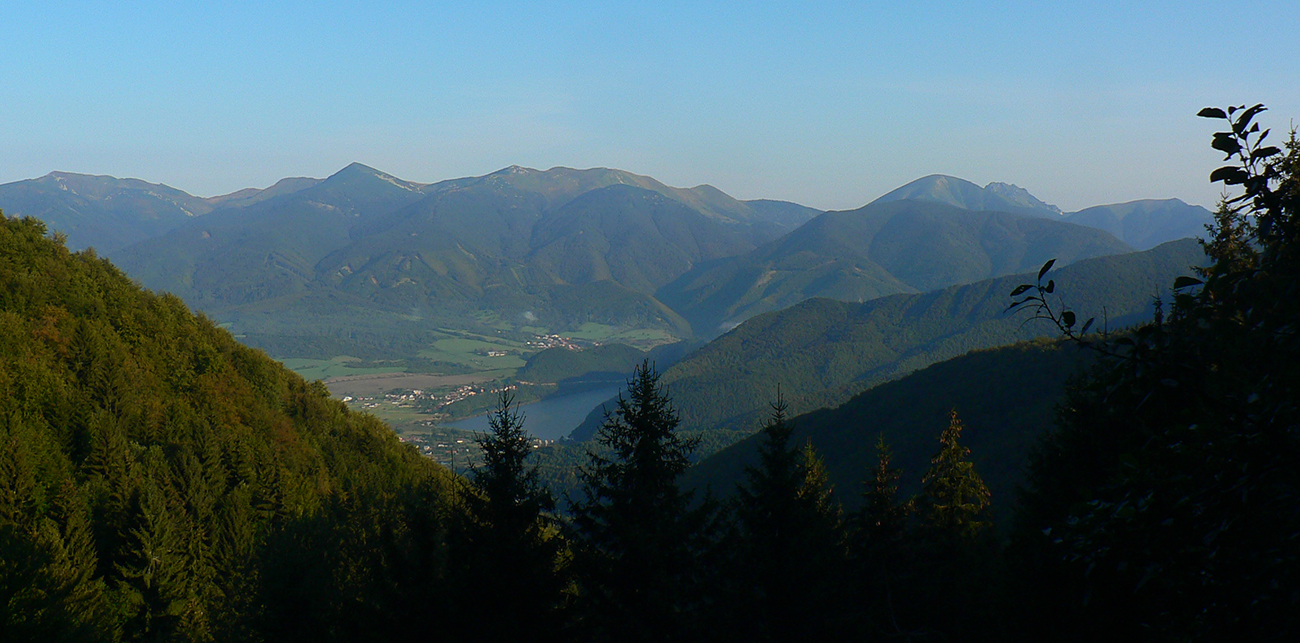 Tak Kľak. Ale pred ním ešte Chládkové. Tretia, poriadne dlhá strmina, taká dvojdielna - a na jej konci poriadna divočina aj s „tunelom“ pod spadnutým stromom. Tak pekne pomaličky. Po desiatej, skoro šesť hodín po štarte, sme si nakrátko užili panorámy z vrcholu - najmä Turiec napravo, lebo Fatra stála priamo proti slnku. Prvá časť za nami – bola typická dlhými výstupmi, prekladanými tiež dlhými výhľadmi.
