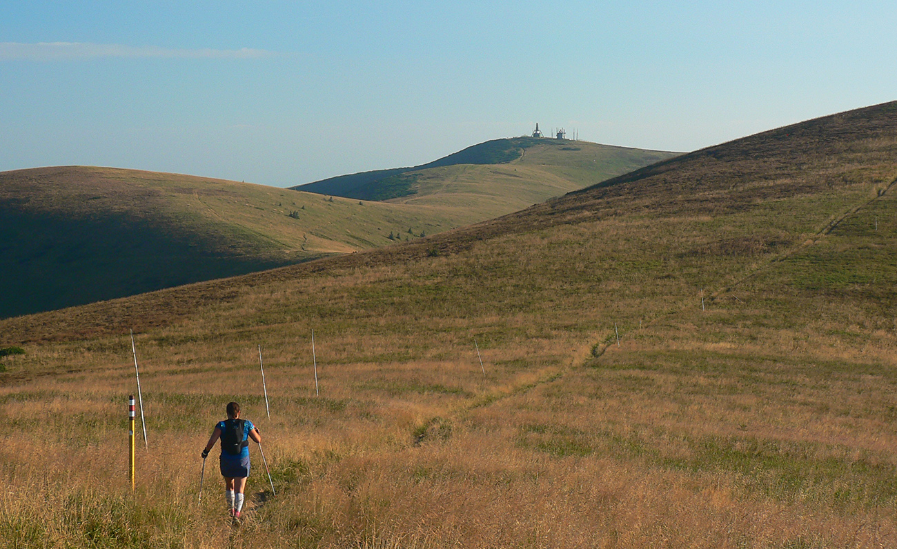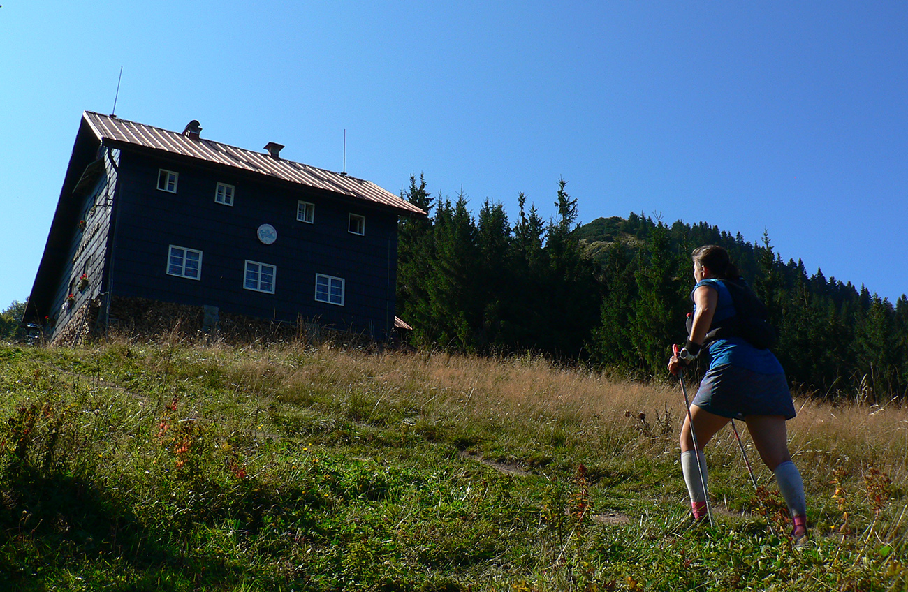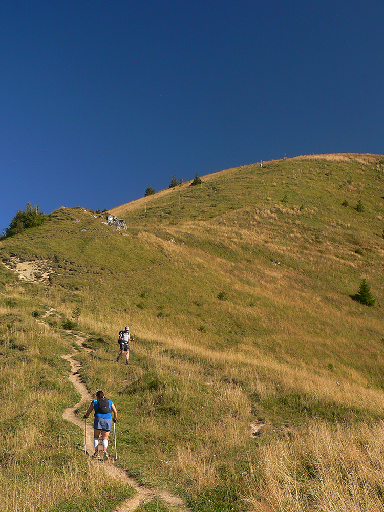 Ešte pokecám s chatárom - svet je malý, spoločných známych dosť. Dotankujeme v umyvárke a utekáme pred fanúšikmi na Ploskú, aspoň sme tam skôr. Tiež je hnusne strmá, ale aspoň prehľadná. S otvorenými výhľadmi sa aj lepšie tipuje, ako dlho nám to ešte bude trvať. Už vieme, že na otočku z domu to nebude, lebo posledný bus nestíhame, tak Julka objednáva súkromný odvoz. Ešte že má v BB kde spať – no celebrita, tú všade radi vidia. Netreba sa nám hnať. Takže táto posledná, hôľna časť je už fakt za odmenu. Aj svetlo krásnie, blíži sa zlatá hodinka.