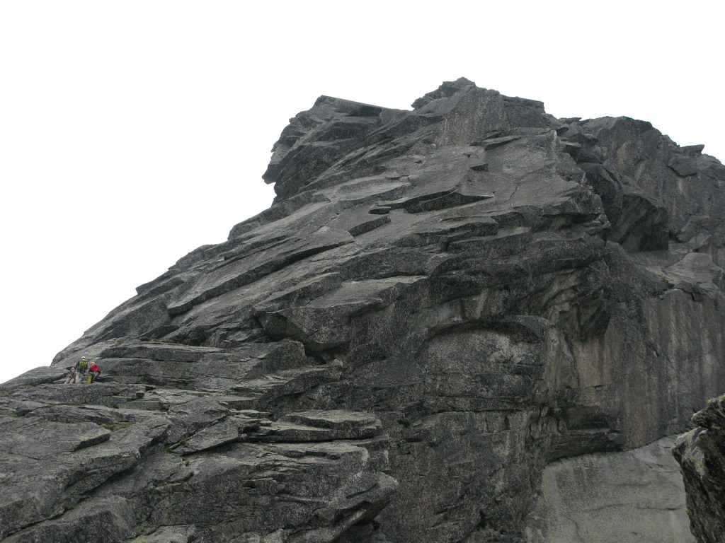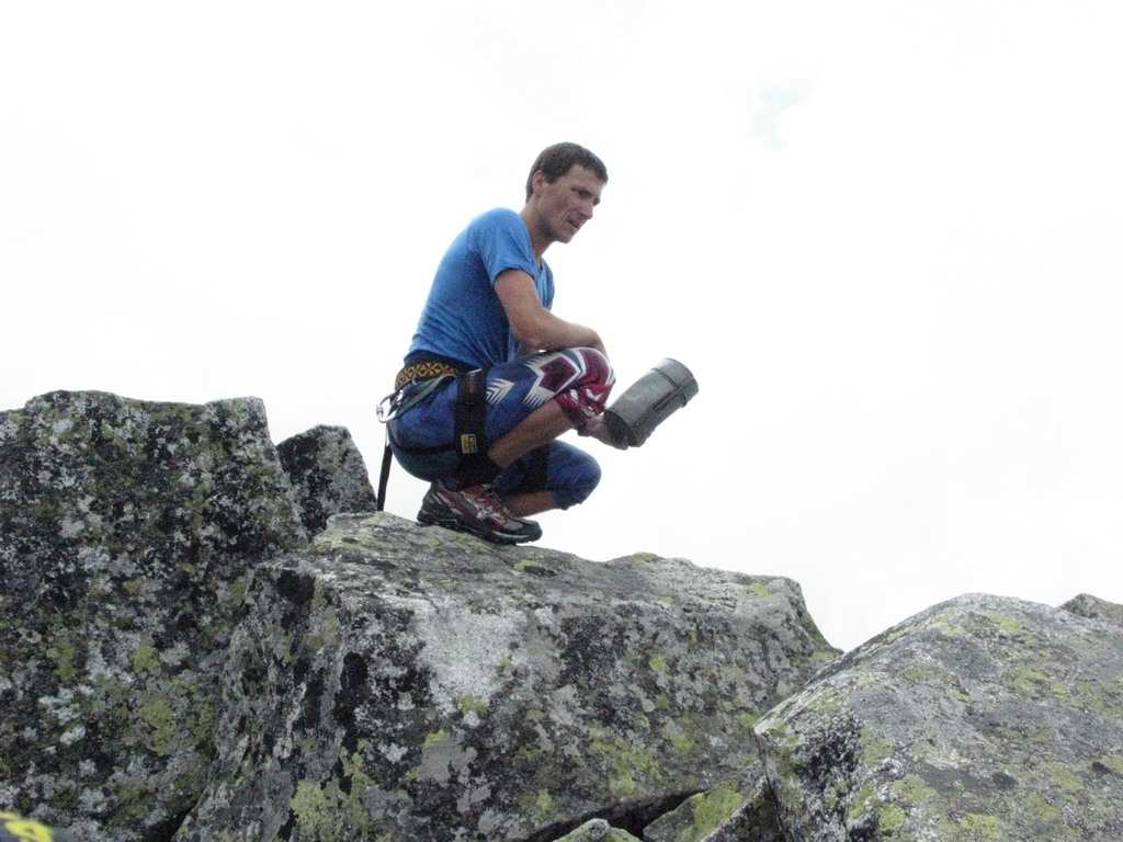 Po chvílke nerozhodnosti vyťahujem telefón. Na druhý pokus sa dovolám: Kamarát Palo, s ktorým sme sa dlho nevideli neváha a odpovedá: Komínom nechoď, radšej traverzni vľavo. Zostup je rebrom smer dolina a potom rampou vpravo. zlaňovať netreba."